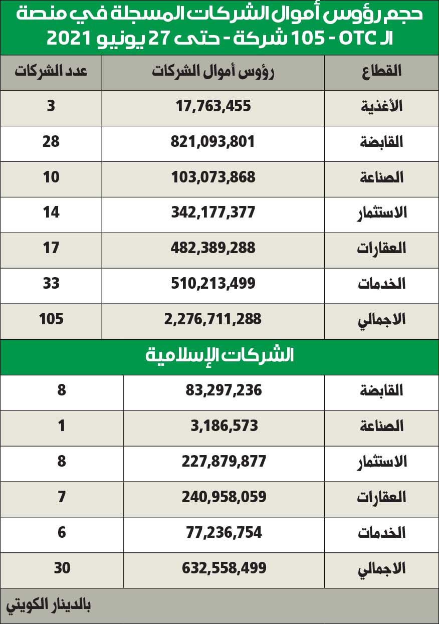 وبيّن أن إجمالي رؤوس اموال الشركات المسجلة على المنصة، وعددها 105 شركات، يتجاوز ملياري دينار، تمثل نحو 6 في المئة من القيمة السوقية للشركات المدرجة، متوقعاً زيادة عدد الشركات المدرجة في سوق الـ OTC إلى 150 شركة خلال الفترة المقبلة لعدة أسباب، أهمها أنها افضل وسيلة لضمان شفافية الأسعار على أسهم الشركات غير المدرجة، بالإضافة الى ان منصة OTC تعتبر أفضل وسيلة يتطلع إليها المساهمون والمبادرون لتخارجات مستقبلية ناجحة لقطاع المشاريع الناشئة، ومشاركتهم للمستثمرين، ومؤخراً كان التسجيل الناجح لشركة براندات للتجارة الالكترونية من خلال المنصة. وذكر أن الشركات المدرجة على المنصة تتوزع بين 28 شركة قابضة، و33 شركة خدمات، و14 شركة استثمارية، و17 شركة عقارية، و10 شركات صناعية، و3 شركات أغذية، وشركة واحده للتجارة الالكترونية، بالإضافة الى عدد من الشركات المنسحبة من البورصة.ولفت إلى أن التداول في سوق الشركات غير المدرجة لا يتطلب سوى توافر حساب لدى أحد الوسطاء وتوافر "الكاش" الكافي للشراء، مشيرا الى أن كل المنظومة مستفيدة من هذه المنصة، حيث تتشارك شركة البورصة العمولات مع مكاتب الوساطة، ونسبة بسيطة منها للشركة الكويتية للمقاصة.وأشار إلى أن المنصة اتاحت للبنوك امكانية تقييم الأسهم غير المدرجة مما يمنحها فرصة للتوسع في امكانية منح المساهمين في هذه الشركات للحصول على التمويل.