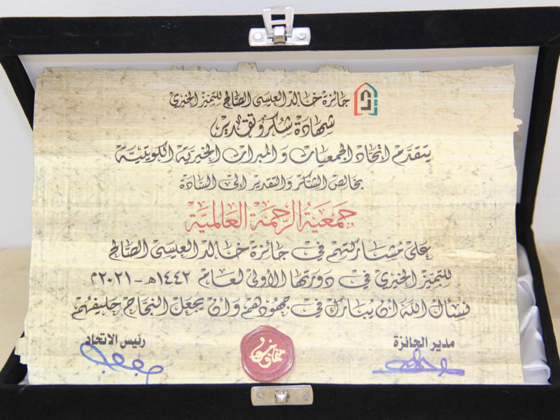 حصلت جمعية الرحمة العالمية على المركز الثاني في جائزة "خالد العيسى الصالح" للتميز الخيري عن فيلم "رحمة" كأفضل فيديو توثيقي، خلال الحفل الذي أقامه اتحاد الجمعيات والمبرات الخيرية الكويتية، بحضور ممثلين عن وزارتي الشؤون والتنمية المجتمعية، ولفيف من قيادات العمل الخيري.وقال الأمين المساعد لشؤون القطاعات في "الرحمة العالمية" فهد الشامري: "إن الجمعية، وعلى مدار السنوات الماضية، أولت توثيق جهودها الخيرية اهتماماً كبيراً، دعماً لثقة المتبرعين بصفة خاصة، وفي العمل الخيري الكويتي بشكل عام"، مشدداً على ضرورة مواصلة توثيق العمل الخيري، وتدوينه بمختلف الوسائل الحديثة، وبمعايير مهنية ومنهجية واضحة، بما يسهم في الحفاظ على صورة العطاء الكويتي محلياً وعالمياً.