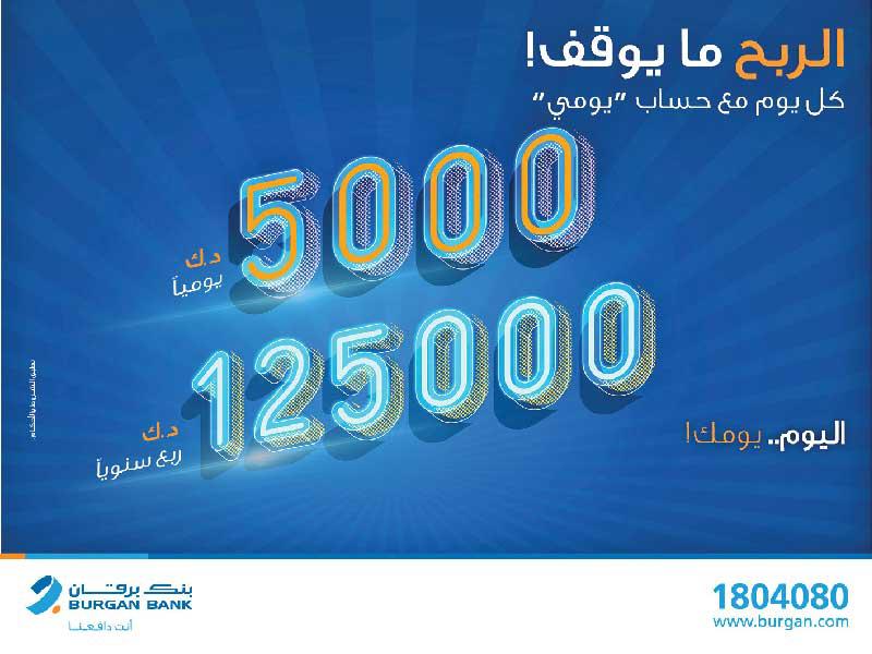 2. فاطمة عبدالله علي3. فيلوسامي أروموغام4. حمد محمد السعد5. مصطفى جاسم المطوعوبالإضافة للسحب اليومي، يوفر بنك برقان سحبا ربع سنوي على حساب «يومي» للفوز بجائزة نقدية بقيمة 125.000 دينار. وللتأهل للسحوبات ربع السنوية يتعين على العملاء ألا يقل رصيدهم عن 500 دينار لمدة شهرين كاملين قبل تاريخ السحب، كما أن كل 10 دينار تمثل فرصة واحده لدخول السحب. وإذا كان رصيد الحساب 500 دينار وما فوق، فسوف يكون صاحب الحساب مؤهلاً للدخول في كل من السحوبات اليومية وربع السنوية.