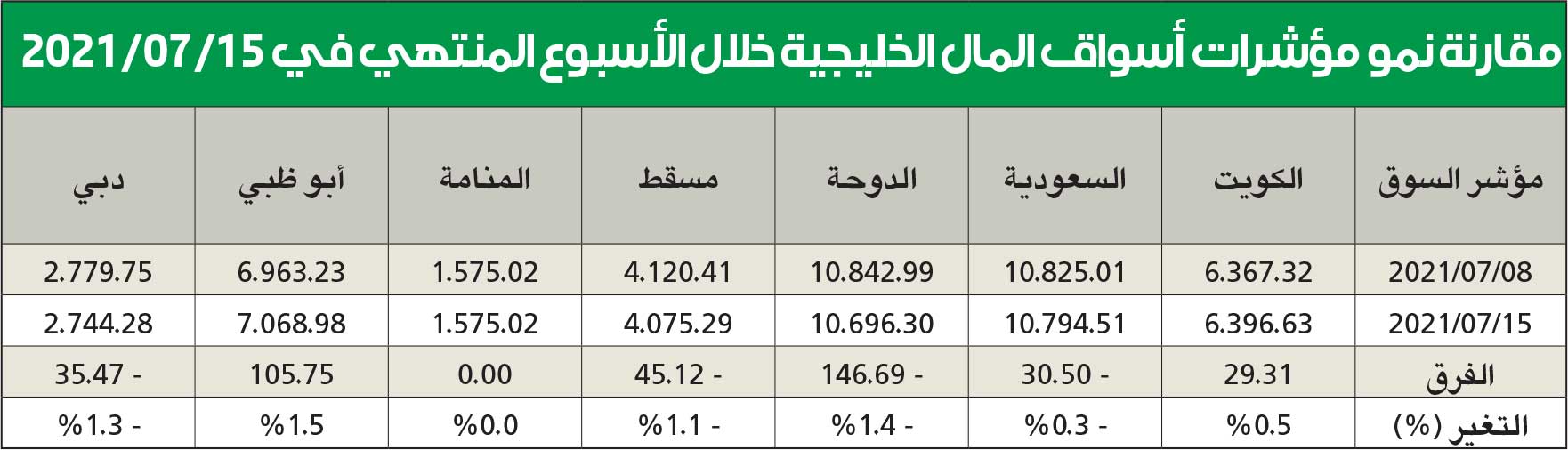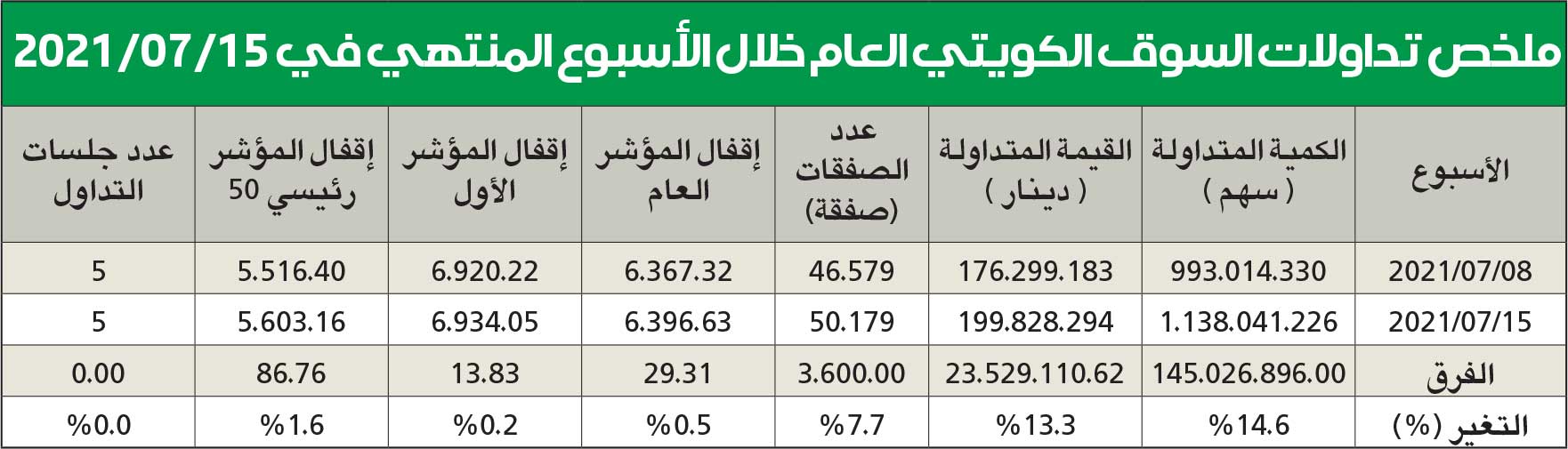 بعد هدوء وفتور استمر حوالي سبع جلسات ومنذ بداية شهر يوليو الجاري ارتدت مؤشرات بورصة الكويت خلال تعاملات الجلسات التي سبقت عطلة العيد الطويلة، وعلى الرغم من قرب العطلة، فإن مؤشر السوق العام ربح نصف نقطة مئوية أي 29.31 نقطة ليقفل على مستوى 6396.63 نقطة.بينما سجل مؤشر السوق الأول نسبة أقل كانت عُشري نقطة مئوية فقط تعادل 13.83 نقطة ليقفل على مستوى 6934.05 نقطة، وكان التركز والدعم على أسهم السوق الرئيسي، ورئيسي 50 الذي قفز بنسبة كبيرة وحقق نمواً بنسبة 1.6 في المئة أي 86.76 نقطة ليقفل على مستوى 5603.16 نقاط.وارتفعت متغيرات السوق الرئيسية الثلاثة (السيولة وكمية الأسهم المتداولة وعدد الصفقات) إذ زادت السيولة بنسبة 13.3 في المئة مقارنة بسيولة الأسبوع السابق، ونما كذلك عدد الأسهم المتداولة بنسبة مقاربة كانت 14.6 في المئة وارتفع عدد الصفقات بنسبة أقل كانت 7.7 في المئة.وجاء الارتفاع والدعم خلال آخر جلستين على الرغم من إعلان بعض النتائج التي لم تدعم أسهمها كان أهمها إعلانات بنك بوبيان وسهم زين. وعلى الرغم من نمو الأرباح، فإنها كانت دون التقديرات، ولم يؤثر في الأداء الذي اعتمد على التحضير فترة ما بعد العطلة وتدفق بيانات مالية إيجابية خصوصاً في قطاعي الاستثمار والعقار اللذين استحوذا على معظم نشاط السوق الموجود في «الرئيسي» و«رئيسي 50».واستقر مؤشر سوق البحرين المالي دون تغير إذ ربحت 8 شركات وخسر مثلها وسط تداولات جيدة على أسهم قطاع البنوك الذي ينتظر إعلانات الربع الثاني مبكراً قبل بقية القطاعات، وأقفل مؤشر سوق البحرين على مستوى 1575.02 نقطة.