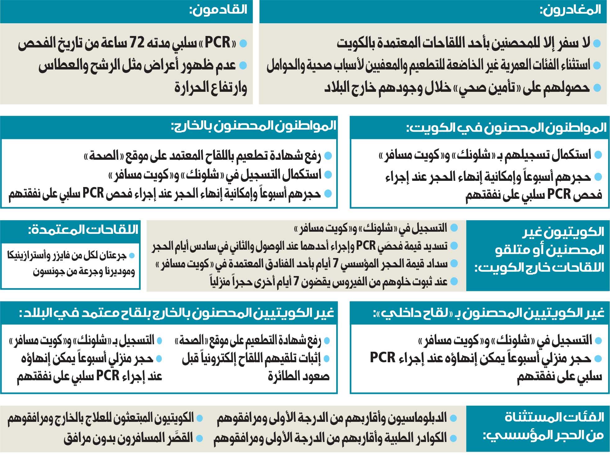 وشدد على ضرورة حصول الكويتيين على تأمين صحي طوال فترة وجودهم خارج البلاد، مع تغطية هذا التأمين لعلاج الإصابة بـ «كورونا».وبشأن القدوم إلى البلاد، أكد التعميم عدم قبول أي راكب قادم إلا بعد حصوله على شهادة فحص «PCR» سلبية تثبت خلوه من الفيروس شريطة أن تكون سارية المفعول (72 ساعة من إجراء الفحص إلى صعوده على الرحلة)، وألا تظهر عليه أي أعراض مثل الرشح والعطاس وارتفاع درجة الحرارة والكحة.وعن المواطنين وأقاربهم من الدرجة الأولى والعمالة المرافقة لهم، أوضح التعميم أن المحصنين الذين تلقوا اللقاح داخل الكويت، ويظهر لهم اللون الأخضر بـ «مناعة» أو «هويتي»، يستكملون التسجيل بتطبيق «شلونك» ومنصة «کویت مسافر».وأضاف أنه سيُطبَّق على جميع المواطنين المحصنين حجراً منزلياً أسبوعاً من تاريخ وصولهم للكويت، وفي حالة رغبتهم في إنهاء الحجر يجرون «PCR» واحداً، والدفع داخل الكويت خلال فترة الحجر، وإذا أظهرت نتيجته الخلو من الإصابة يُنهى حجرهم. وتابع: أما المحصنون في الخارج باللقاحات المعتمدة في الكويت فيعتمدون شهادة تلقي اللقاح عن طريق رفعها على موقع «الصحة»، ويستكملون التسجيل بـ «شلونك» و«كويت مسافر»، ويطبق عليهم الحجر المنزلي أسبوعاً من تاريخ وصولهم للكويت، لافتاً إلى أنه في حال رغبتهم في إنهاء الحجر يجرون «PCR» واحداً والدفع داخل الكويت خلال فترة الحجر، وإذا أظهرت نتيجته الخلو من الإصابة يُنهى حجرهم.وأوضح التعميم أن غير المحصنين، الذين يظهر اللونان الأحمر أو الأصفر لهم بتطبيقَي «مناعة» و«هويتي» يستكملون التسجيل في تطبيق «شلونك» ومنصة «كويت مسافر» على أن يسددوا قيمة فحصَي «PCR» وإجراء أحدهما عند الوصول للكويت، والآخر باليوم السادس من الحجر المؤسسي، إلى جانب دفع قيمة حجرهم 7 أيام مؤسسياً لدى أحد الفنادق المحلية المعتمدة بالمنصة.وأضاف: في حال ثبوت الخلو من كورونا تُستكمل مدة الحجر 7 أيام أخرى بالمنزل، ويستثنى من الحجر المؤسسي الفئات المعفاة منه، مؤكداً أن المتلقين بالخارج للقاح غير معتمد في الكويت يعاملون معاملة غير المحصنين.أما غير الكويتيين، فأشار التعميم إلى أن المتلقين للقاح داخل الكويت، وبعد ظهور اللون الأخضر بتطبيقي «مناعة» و«هويتي»، سيستكملون التسجيل في «شلونك» وبـ «كويت مسافر»، ويطبق عليهم حجر منزلي أسبوعاً من تاريخ الوصول إلى الكويت، وفي حال رغبتهم في إنهاء الحجر لابد من إجراء فحص «PCR» واحد والدفع داخل الكويت خلال فترة الحجر الذي ينتهي عند ظهور نتيجة سلبية للفحص.وذكر أن المحصنين المتلقين للقاح معتمد خارج الكويت عليهم اعتماد شهادة التطعيم عبر رفعها على موقع وزارة الصحة، على أن يثبتوا تطعيمهم إلكترونياً قبل الصعود إلى الطائرة وعند الوصول من خلال إمكانية التدقيق الإلكتروني (QR-Code) بالكويت، مع استكمال التسجيل في «شلونك» و«كويت مسافر»، لافتاً إلى أنه يطبق على الجميع حجر منزلي أسبوعاً من تاريخ وصولهم إلى الكويت، وفي حالة الرغبة في إنهائه لابد من إجراء فحص «PCR» واحد على أن يدفعوا قيمته داخل الكويت خلال فترة الحجر، الذي ينتهي عند ظهور نتيجة سلبية للفحص.وعن الفئات المستثناة من الحجر المؤسسي، أوضح التعميم أنها تتمثل في البعثات الدبلوماسية والدبلوماسيين المعتمدين لدى الكويت وأقاربهم من الدرجة الأولى (زوج - زوجة - أبناء) سواء منفردين أو مجتمعين، وعمالتهم المنزلية المرافقة لهم بشرط إبراز الهويات الخاصة بهم، إضافة إلى المرضى الكويتيين المبتعثين للعلاج بالخارج ومرافقيهم بعد انتهاء فترة العلاج شريطة وجود شهادة دالة على ذلك صادرة من المكتب الصحي الكويتي في الدولة مقر تلقي العلاج.وذكر أن الفئات المستثناة تشمل أيضاً الكوادر الطبية والأهلية وأقاربهم من الدرجة الأولى (زوج - زوجة - أبناء) سواء منفردين أو مجتمعين، وعمالتهم المنزلية المرافقة لهم، بشرط إبراز الهويات الخاصة بهم، إلى جانب القاصرين المسافرين بدون مرافق.