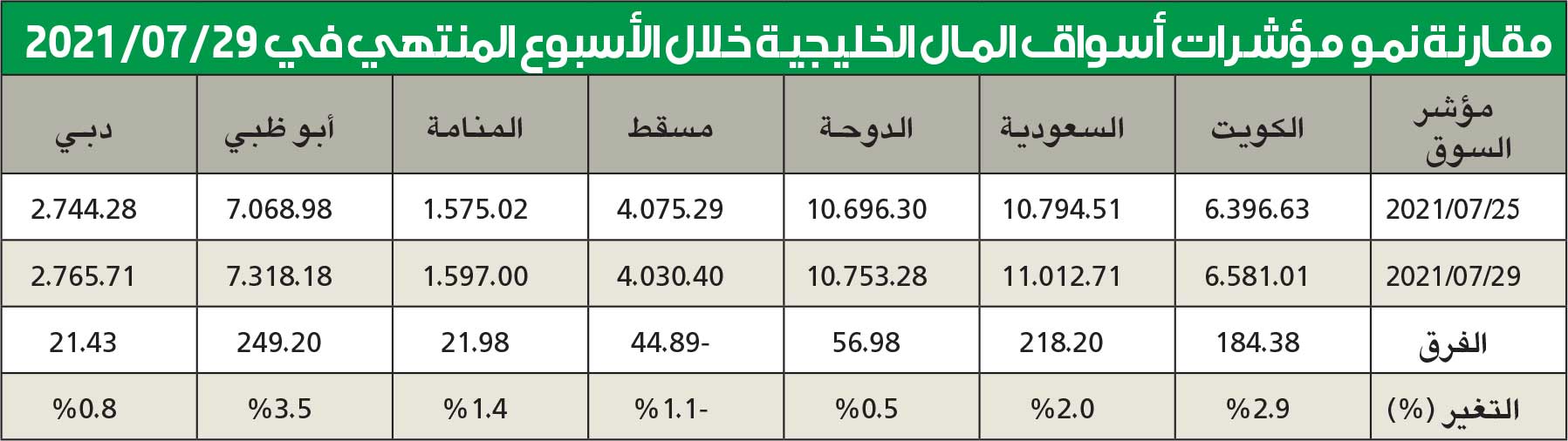 سجلت معظم مؤشرات أسواق المال بدول مجلس التعاون الخليجي مكاسب كبيرة في الأسبوع الأخير من شهر يوليو، وهو أسبوع عمل ما بعد عطلة عيد الأضحى المبارك، وربحت 6 مؤشرات بمكاسب في معظمها كبيرة، بينما كانت الخسارة في مؤشر واحد فقط، وهو مؤشر سوق عمان المالي، حيث خسر نسبة واضحة تجاوزت 1.1 في المئة بقليل، وتصدر الرابحين مؤشر سوق أبوظبي المالي، الذي أضاف 3.5 في المئة كثالث أفضل أسبوع أداء له هذا العام ومقفلا على مستوى قياسي جديد، بينما لم تتجاوز مكاسب مؤشر سوق دبي المالي نسبة 0.8 في المئة، وحل ثانياً مؤشر سوق بورصة الكويت العام، بإضافته نسبة 2.9 في المئة، وهي من أكبر المكاسب الأسبوعية له، وحل ثالثاً مؤشر سوق الأسهم السعودي الرئيسي "تاسي"، بعد أن عاد فوق مستوى 11 ألف نقطة وربح 2 في المئة، وحقق مؤشر سوق البحرين المالي ارتفاعا جيدا بنسبة 1.4 في المئة، بينما اكتفى مؤشر السوق القطري بارتفاع خجول بلغ نصف نقطة مئوية فقط.
