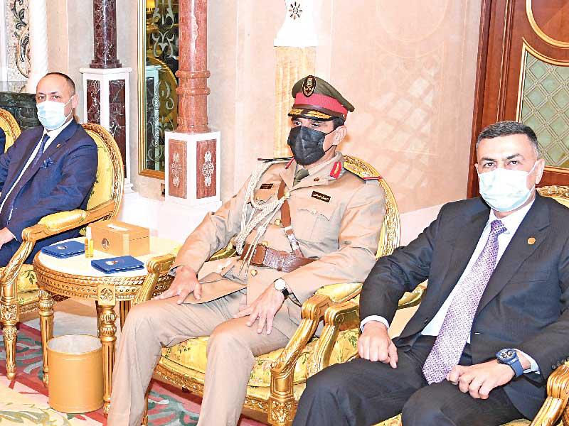 إلى ذلك، عقد الخالد، في قصر بيان أمس، جلسة مباحثات رسمية مع الكاظمي.وجرى خلال جلسة المباحثات التي سادتها أجواء ودية استعراض العلاقات الثنائية الوطيدة بين البلدين، وسبل تعزيزها في شتى المجالات بما يخدم مصالح البلدين والشعبين الشقيقين.كما بحث الجانبان آخر المستجدات والقضايا الإقليمية والعربية والدولية ذات الاهتمام المشترك ومواقف البلدين تجاهها.حضر المباحثات عن الجانب الكويتي وزير النفط وزير التعليم العالي الدكتور محمد الفارس، ووزير الخارجية وزير الدولة لشؤون مجلس الوزراء الشيخ الدكتور احمد الناصر، ووزيرة الاشغال العامة وزيرة الدولة لشؤون الاتصالات وتكنولوجيا المعلومات الدكتورة رنا الفارس، ووزير الداخلية رئيس بعثة الشرف المرافقة الشيخ ثامر العلي، ووزير المالية وزير الدولة للشؤون الاقتصادية والاستثمار خليفة حمادة، ووزير التجارة والصناعة الدكتور عبدالله السلمان، ورئيس ديوان سمو رئيس مجلس الوزراء عبدالعزيز الدخيل، ورئيس الأركان العامة للجيش الفريق الركن الشيخ خالد الصباح، وكبار المسؤولين في الدولة.وحضرها عن الجانب العراقي الوفد المرافق.وأقام الخالد مأدبة غداء رسمية على شرف الكاظمي والوفد المرافق له.مراسم استقبال رسمية