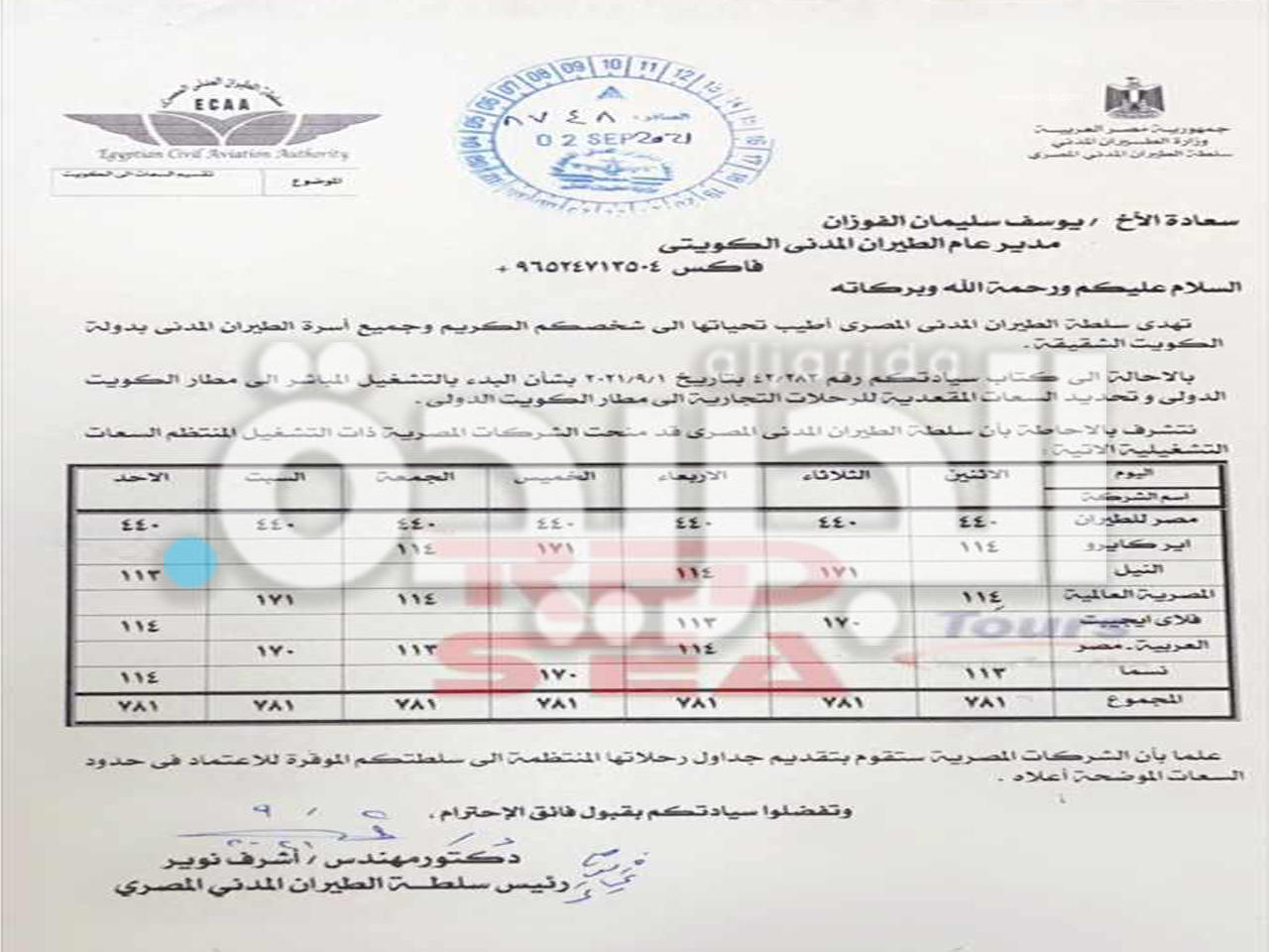 أعلنت سلطة الطيران المدني المصري عن تحديد السعات التشغيلية للرحلات المباشرة إلى دولة الكويت بواقع 781 موزعة على 7 شركات طيران مصرية.وأكد «الطيران المدني المصري» في كتابه وجهه إلى الإدارة العامة للطيران المدني الكويتي أن الشركات المصرية ستقوم بتقديم جداول رحلاتها بشكل رسمي لاعتمادها.