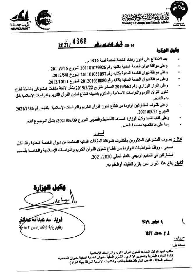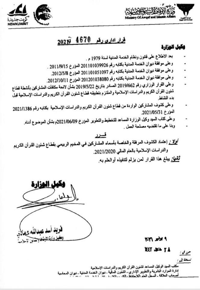 أما البند الثاني فيقضي بأن «يبلغ هذا القرار لمن يلزم لتنفيذه أو العلم به».ولمزيد من التأكيد، أصدر الوكيل عمادي قراراً آخر تحت رقم 4670 ينص بنده الأول على «اعتماد الكشوف المرفقة والخاصة بأسماء المشاركين في المخيم الربيعي بقطاع شؤون القرآن الكريم والدراسات الإسلامية بالعام المالي 2020/2021»، أما البند الثاني فينص على أن «يبلغ هذا القرار لمن يلزم لتنفيذه أو العلم به».وتعقيباً على توضيح «الأوقاف»، فلا نملك إلا أن نتساءل: هل تنفي الوزارة صحة هذين القرارين المعنيين بصرف المكافأة للمشاركين بنشاط «المخيم الربيعي»؟