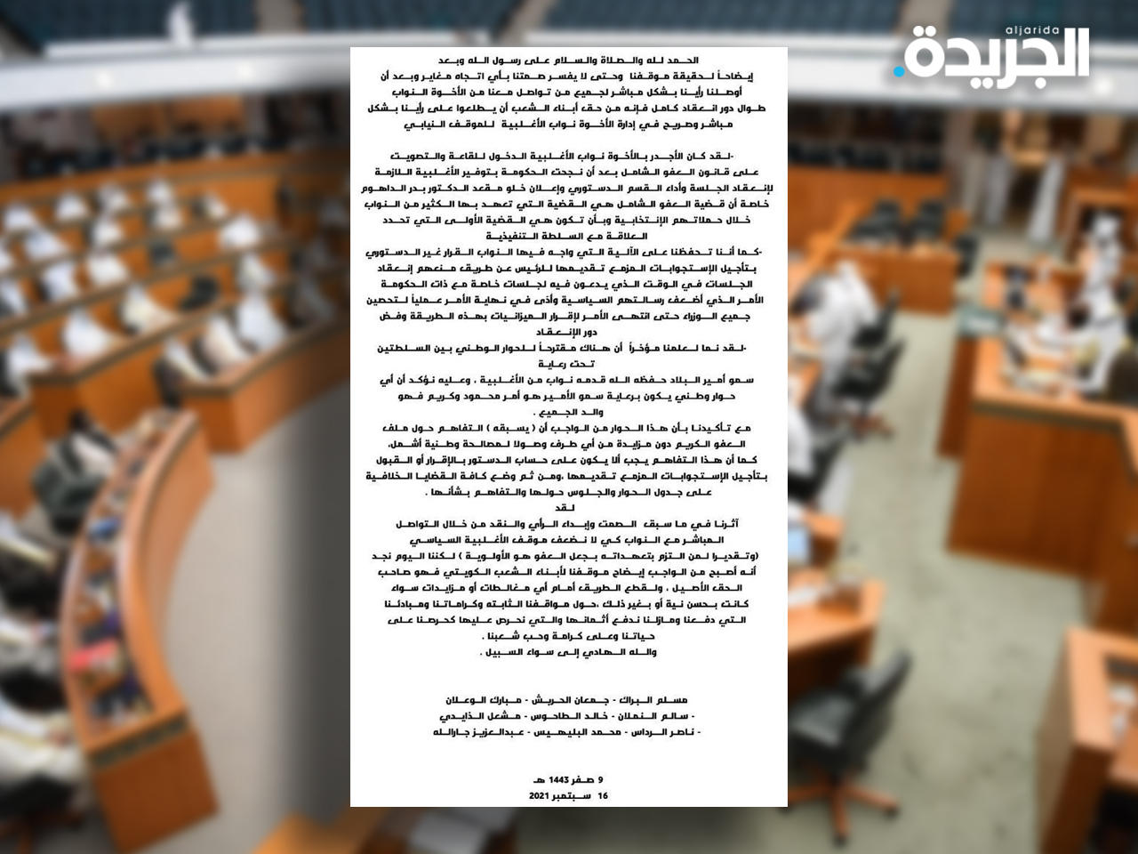 كما أننا تحفظنا على الآلية التي واجه فيها النواب القرار غير الدستوري بتأجيل الإستجوابات المزمع تقديمها للرئيس، عن طريق منعهم إنعقاد الجلسات في الوقت الذي يدعون فيه لجلسات خاصة مع ذات الحكومة الأمر الذي أضعف رسالتهم السياسية، وأدى في نهاية الأمر عملياً لتحصين جميع الوزراء حتى انتهي الأمر لإقرار الميزانيات بهذه الطريقة وفض دور الإنعقاد.لقد نما لعلمنا مؤخراً، أن هناك مقترحاً للحوار الوطني بين السلطتين تحت رعاية سمو أمير البلاد حفظه الله قدمه نواب من الأغلبية، وعليه نؤكد ان أي حوار وطني يكون برعاية سمو الأمير هو أمر محمود وكريم، فهو والد الجميع.مع تأكيدنا، بأن هذا الحوار من الواجب أن «يسبقه» التفاهم حول ملف العفو الكريم دون مزايدة من أي طرف وصولاً لمصالحة وطنية أشمل كما أن هذا التفاهم يجب ألا يكون على حساب الدستور بالإقرار أوالقبول بتأجيل الإستجوابات المزمع تقديمها، ومن ثم وضع كافة القضايا الخلافية على جدول الحوار والجلوس حولها والتفاهم بشأنها.لقد أثرنا في ما سبق، الصمت وإبداء الرأي والنقد من خلال التواصل المباشر مع النواب كي لا نضعف موقف الأغلبية السياسي، (وتقديراً لمن إلتزم بتعهداته بجعل العفو هو الأولوية)، لكننا اليوم نجد أنه أصبح من الواجب إيضاح موقفنا لأبناء الشعب الكويتي فهو صاحب الحق الأصيل، ولقطع الطريق أمام أي مغالطات أو مزايدات سواء كانت بحسن نية أو بغير ذلك حول مواقفنا الثابتة وكراماتنا ومبادئنا التي دفعنا ومازلنا ندفع أثمانها والتي تحرص عليها كحرصنا على حياتنا وعلى كرامة وحب شعبنا. والله الهادي إلى سواء السبيل.مسلم البراك - جمعان الحربش - مبارك الوعلان . سالم اللملان - خالد الطاحوس - مشعل الخايدي - ناصر الرداس - محمد البليهيس - عبدالعزيز جارالله.
