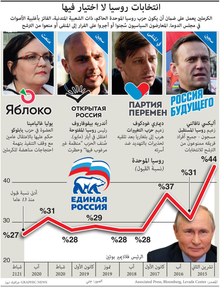 يتوجّه الناخبون الروس اليوم، إلى صناديق الاقتراع للادلاء بأصواتهم في الانتخابات البرلمانية التي ستجرى على مدار 3 ايام، في اقتراع أقصي عنه القسم الأكبر من معارضي الكرملين.ويشارك في هذه الانتخابات التي تجرى للمرة الأولى بعد التعديلات الدستورية الجوهرية التي جرت في صيف العام الماضي 14 حزباً من بينها احزاب سياسية عريقة مثل "الحزب الشيوعي الروسي" و"الحزب الليبرالي الديموقراطي" و"حزب روسيا الموحدة" الحاكم و"حزب روسيا العادلة" و"حركة يابلكو" الليبرالي.وتتنافس الأحزاب السياسية والمرشحون المستقلون على شغل مقاعد مجلس النواب (الدوما) البالغ عددها 450 والموزعة مناصفة بين القوائم الحزبية والدوائر ذات المقعد الواحد.