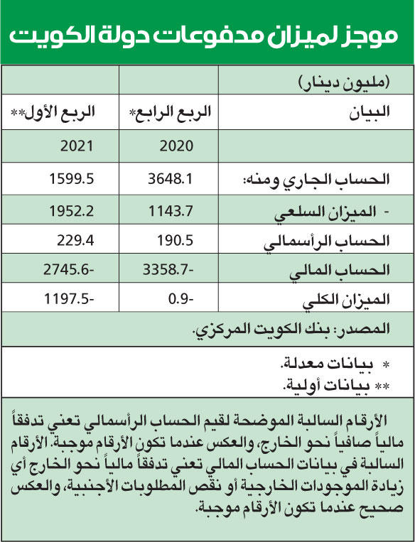 كما تُظهر البيانات الأولية ارتفاع قيمة فائض الميزان السلعي خلال الربع الأول لعام 2021 بنحو 808.6 ملايين دينار أو ما نسبته 70.7 في المئة مقارنةً بالربع السابق، لتبلغ قيمة هذا الفائض نحو 1952.2 مليون دينار، مقابل نحو 1143.7 مليون دينار خلال الربع السابق. ويُعزى ذلك الارتفاع في قيمة الفائض بصفة أساسية لارتفاع قيمة الصادرات النفطية.وسجل حساب الخدمات (صافي قيمة المعاملات المرتبطة بالخدمات فيما بين المقيمين وغير المقيمين، وتشمل خدمات النقل، والسفر، والاتصالات، والإنشاءات، وخدمات أخرى، إضافة إلى الخدمات والسلع الحكومية) انخفاضاً في قيمة العجز خلال الربع الأول من عام 2021 بما قيمته 47.4 مليون دينار وبنسبة 5.6 في المئة ليصل إلى نحو 794.3 مليوناً مقارنة بعجزٍ بلغت قيمته نحو 841.7 مليوناً خلال الربع السابق. وفيما يتعلق بتطورات الحساب المالي (الذي يسجل معاملات تبادل أصول وخصوم مالية بين المقيمين وغير المقيمين في الاقتصاد المحلي) لميزان مدفوعات دولة الكويت، تُشير الإحصاءات الأولية إلى أن هناك تدفقاً مالياً صافياً إلى الخارج (زيادة في صافي قيمة الاستثمارات في الخارج من جانب المقيمين في الاقتصاد المحلي) بلغ نحو 2745.6 مليون دينار خلال الربع الأول لعام 2021، مقابل تدفقٍ ماليٍ صافٍ إلى الخارج بلغ نحو 3358.7 مليون دينار خلال الربع السابق. ونتيجة للتطورات في الحسابات الرئيسية للميزان، سجَّل الوضع الكلي لميزان مدفوعات الكويت خلال الربع الأول لعام 2021 عجزاً بلغت قيمته نحو 1197.5 مليون دينار، مقابل عجزٍ بلغت قيمته نحو 0.9 مليون دينار خلال الربع السابق.وبنظرةٍ أكثر شمولية إلى وضع ميزان مدفوعات الكويت تأخذ في الاعتبار التغير في صافي قيمة الموجودات الخارجية لبعض الجهات المسجلة ضمن بند "الحكومة العامة"، إضافة إلى قيمة إجمالي الأصول الاحتياطية لبنك الكويت المركزي (تغير)، فإن الوضع الكلي لميزان المدفوعات بالمفهوم الواسع يُظهر فائضاً خلال الربع الأول لعام 2120 بلغت قيمته نحو 4961.0 مليون دينار، مقارنةً بفائض بلغت قيمته نحو 993.5 مليون دينار خلال الربع السابق له.