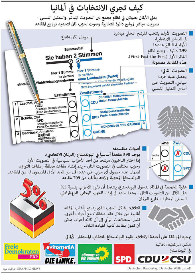 أي أكثرية ستخلف الائتلاف الوسطي بين المحافظين "المسيحيين الديموقراطيين" في "الاتحاد الديموقراطي المسيحي" CDU و"الاتحاد الاجتماعي المسيحي" CSU من جهة و"الحزب الاشتراكي الديموقراطي" SPD من جهة أخرى؟ لم يكن يوماً الغموض مسيطراً إلى هذه الدرجة في هذا البلد الذي كان معتاداً حتى مؤخراً على الثنائية الحزبية.وأدى الاهتمام المتزايد بقضايا المناخ إضافة إلى تبنّي قسم من السكان موقفاً متطرفاً بشأن سياسة الهجرة، إلى صعود حزبين آخرين هما "الخضر" وحزب "البديل من أجل ألمانيا" AFD اليميني المتطرف.وكانت النتيجة تراجع شعبية الحزبين الكبيرين لاسيما "الديموقراطي المسيحي".ويتصدّر "الاشتراكي الديموقراطي" نوايا التصويت في استطلاع للرأي نُشر أمس الأول، بحصوله على 25 في المئة من الأصوات مقابل 22 في المئة لـ"لاتحاد الديموقراطي المسيحي" و15 في المئة لحزب "الخضر" و11 في المئة لحزب "البديل من أجل ألمانيا".وأمس، أظهر استطلاع حديث للرأي أجرته مؤسسة "يوغوف"، أن 74 في المئة من الناخبين الذين يحق لهم التصويت يقولون إنهم اتخذوا قرارهم بالفعل بشأن الحزب الذي سيختارونه.وفيما يتعلق بالحزب الذي سيصوت له من شملهم الاستطلاع، احتل SPD المرتبة الأولى بنسبة 25 في المئة، يليه CDU وCSU بنسبة 21 في المئة، وجاء "الخضر" في المرتبة الثالثة بنسبة 14 في المئة، بينما حصل AFD على 12 في المئة، و"حزب الديموقراطيين الأحرار" FDP المؤيد لقطاع الأعمال على 11 في المئة، وحزب "دي لينكه" اليساري المتطرف على 7 في المئة.ويوضح المحلل السياسي كارل رودولف كورتي، أن "استطلاعات الرأي لا تُظهر فائزاً واضحاً، إذا أخذنا في الاعتبار هامش الخطأ، فهناك في النهاية 3 أحزاب نتائجها متقاربة جداً".وقد توجّه هذه الانتخابات ضربة قاسية للمحافظين (حزب ميركل) الذين لطالما كانوا يحصلون على أكثر من 30 في المئة من الأصوات أثناء الانتخابات التشريعية.لاشيت وشولتز وبيربوك