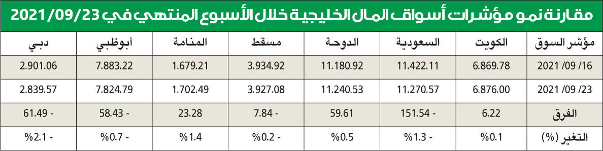 تباين أداء مؤشرات الأسواق المالية بدول مجلس التعاون الخليجي في ثالث أسبوع من شهر سبتمبر، والذي انتهى يوم الخميس الماضي لـ 6 مؤشرات، بينما أقفل السوق السعودي تعاملاته يوم الأربعاء وحجب جلسة الخميس بسبب عطلة اليوم الوطني السعودي، وربحت مؤشرات أسواق البحرين وقطر والكويت، بينما خسرت مؤشرات دبي والسعودية وأبوظبي وعمان، وكانت الخسائر أكبر، حيث فقد دبي نسبة 2.1 في المئة، بينما تراجع المؤشر السعودي الرئيسي «تاسي» بنسبة 1.3 في المئة، كما حذف مؤشر أبوظبي نسبة 0.7 في المئة، واستقر مؤشر سوق مسقط على خسارة محدودة بنسبة عُشري نقطة مئوية، بينما كان الرابح الأكبر مؤشر سوق البحرين بنسبة 1.4 في المئة، تلاه مؤشر قطر بنصف نقطة مئوية، وسجّلت مؤشرات بورصة الكويت إقفالا أخضر بارتفاع محدود بعُشر نقطة مئوية.