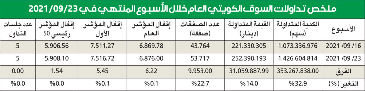 بعد بداية جيدة لمؤشرات بورصة الكويت، ترددت بمنتصف الأسبوع قبل ان تعود بسرعة قبيل نمهايته وتنتهى الى ارتفاع مؤشر السوق العام بنسبة محدودة كانت عُشر نقطة مئوية هي 6.22 نقاط، ليقفل على مستوى 6876 نقطة، وكانت مكاسب السوق الأول مساوية هي 5.45 نقاط، ليقفل على مستوى 7516.72 نقطة، بينما استقر مؤشر رئيسي 50 على نمو أقل كان فقط 1.54 نقطة، ليقفل على مستوى 5908.1 نقاط. وكان نمو تداولات الأسهم في الرئيسي واضحا، حيث دعم النشاط الذي سجل ارتفاعا بعدد الأسهم المتداولة بنسبة 32.9 في المئة قياسا على الأسبوع السابق، مقابل نمو اقل للسيولة، لكنه كان مُرضيا، حيث كانت سيولة الأسبق مدعومة بسيولة الصناديق الفاترة فوتسي راسل، والتي أعادت مراجعة الأوزان نهاية الأسبوع الثاني، وكان ارتفاعه بنسبة 14 في المئة، وارتفع عدد الصفقات بنسبة 22 في المئة، واستمرت عمليات الشراء، خصوصا على سهم الوطني وبيتك وصناعات وأهلي متحد والبورصة وبعض الأسهم العقارية كالتجارية العقارية والوطنية وعقارات الكويت ومباني، وسط ترقّب إعلانات الربع الثالث الذي سينتهى هذا الأسبوع، وتبدأ الشركات بافصاحاتها الفصلية.