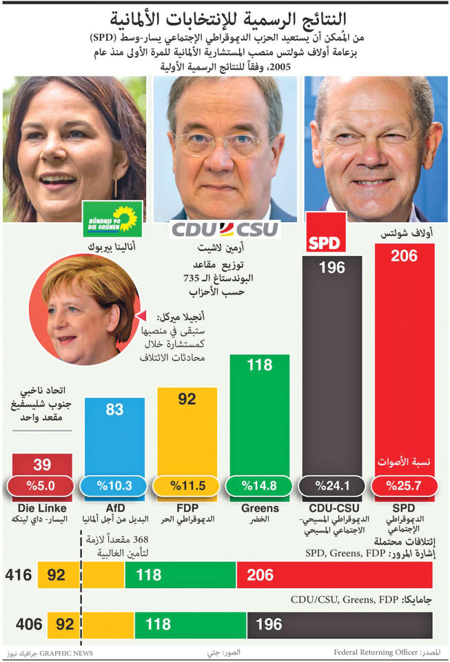 وحصل "الاشتراكي الديموقراطي" على 25.7 بالمئة من الأصوات، وهي أفضل نتيجة يحققها منذ سنوات، في حين تراجع التحالف المسيحي، الذي يضم حزب "الاتحاد المسيحي الديموقراطي" CDU وشقيقه البافاري حزب "الاتحاد الاجتماعي المسيحي" CSU، إلى مستوى قياسي، حيث حصل على 24.1 بالمئة من الأصوات، وحلّ بالمرتبة الثانية.ويقول المرشحان الرئيسيان لمنصب المستشار المقبل، أولاف شولتز من "الاشتراكي الديموقراطي" وأرمين لاشيت من النحالف المسيحي، إنهما يريدان قيادة الحكومة المقبلة، وينوي كل منهما إيجاد غالبية في البرلمان. ويتمتع شولتز بفرصة أفضل لقيادة الحكومة الجديدة، لكنّ الدستور يتيح أيضا لثاني أكبر حزب في البرلمان إمكانية قيادة حكومة. وهناك حزبان سياسيان آخران سيساهمان في تحديد القائد الجديد للحكومة، وهو "حزب الخضر" البيئي الأقرب الى طروحات اليسار و"الحزب الديموقراطي الحر" FDP الليبرالي حزب الأعمال الأقرب الى المحافظين، بعد أن حصل الأول على 14.8 بالمئة من الأصوات والثاني على 11.5 بالمئة.وفي حال قرر طرفا الائتلاف الحاكم الحالي، "التحالف المسيحي" و"الاشتراكيون" عدم مواصلة ائتلافهما، سيتعين على كل منهما إقناع حزبي "الخضر" و"الأحرار"، اللذين لهما أجندات سياسية مختلفة تماماً، بالانضمام إليهما لتشكيل ائتلاف حكومي ثلاثي.وستكون الحكومة المقبلة هي الأولى منذ 16 عاماً التي لا تقودها ميركل. ويعتبر هذا التحول في تشكيل الحكومة الجديدة، الذي قد يستغرق أسابيع أو حتى شهورا، تاريخيا.