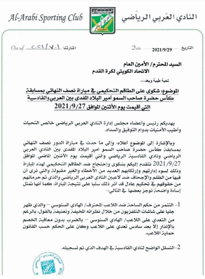 قدم مسؤولو العربي شكوى إلى مجلس إدارة اتحاد الكرة، ضد طاقم تحكيم مباراة الديربي التي جمعت الأخضر مع القادسية مساء الاثنين الماضي على استاد جابر الأحمد الدولي، في الدور نصف النهائي لبطولة كأس سمو الأمير، والتي حسمها الأصفر لمصلحته بهدف من دون رد، أحرزه المحترف العراقي علي فائز.يذكر أن الحكم الدولي عبدالله الجمالي (حكم ساحة) أدار المباراة وساعده سيد علي محمود، وأحمد الصادق قبل أن يتعرض للإصابة ويتولى المهمة بدلاً منه عبدالهادي العنزي، إلى جانب عبدالله الكندري (حكماً لتقنية الفيديو المساعد V A R). وقال مسؤولو النادي في شكواهم إن احتجاجهم على طاقم التحكيم يرجع لسوء إدارتهم للمباراة، وارتكاب العديد من الأخطاء غير المقبولة، والظالمة والمجحفة ضد لاعبي العربي، الذين تم حرمانهم من حقوقهم، الأمر الذي أثر على نتيجة اللقاء.
