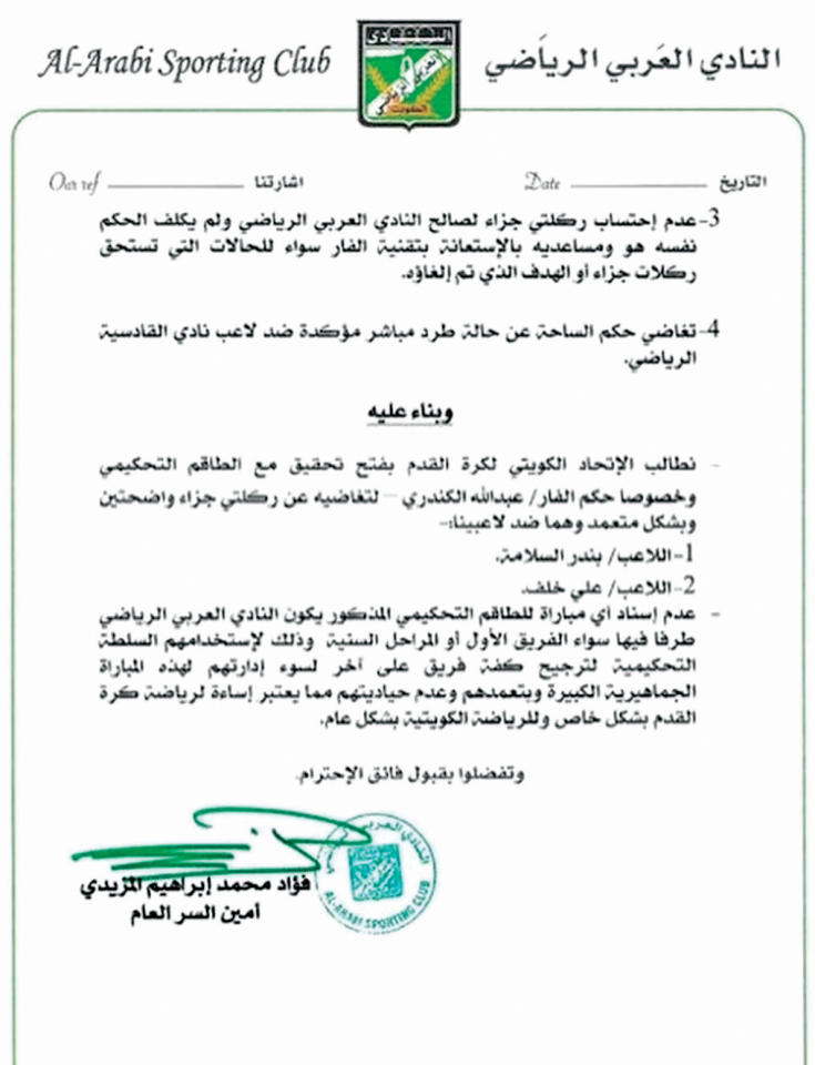وطالب مسؤولو العربي في شكواهم بالتحقيق مع طاقم التحكيم، ولا سيما الكندري، وبعدم إسناد أي مباراة للفريق الأول أو المراحل السنية بالنادي إليهم؛ لعدم حياديتهم، وترجيح كفة فريق على آخر من خلال قراراتهم، وهو أمر يسيء للرياضة الكويتية عموماً ولكرة القدم خصوصاً.