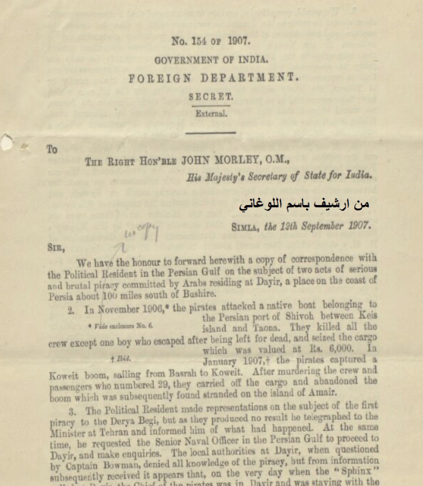 وبعد ذلك يوضح التقرير للوزير أنه في حالة الموافقة على هذه المقترحات، فإنه لا يتعيّن على القوات البريطانية أن تدخل المياه الإقليمية الفارسية فقط، بل يتعيّن عليها أيضاً إنزال قوات مسلحة على سواحل إيران. وفيما يتعلّق بردّ فعل إيران على ذلك، يقول التقرير إنه سبق لحكومة فارس أن استنكرت بشدة دخول سفينة عسكرية بريطانية مياهها الإقليمية عام 1903، عندما حاول مجرمون شنّ هجوم منظم على الكويت، إلّا أن الحكومة البريطانية أبلغت الحكومة الفارسية أنه رغم أنها تحترم سيادة الحكومة الإيرانية، وعلى استعداد للتعاون الكامل معها، فإنها في حال غياب أية إجراءات فعالة من قبل القوات البحرية الإيرانية، فإن الحكومة البريطانية تحتفظ بحقها في اتخاذ الإجراءات المناسبة، وعلى مسؤوليتها الكاملة لردع القراصنة ومعاقبتهم.نتوقف عند هذا الحد في مقالنا اليوم، ونكمل التفاصيل في المقال المقبل إن شاء الله تعالى.