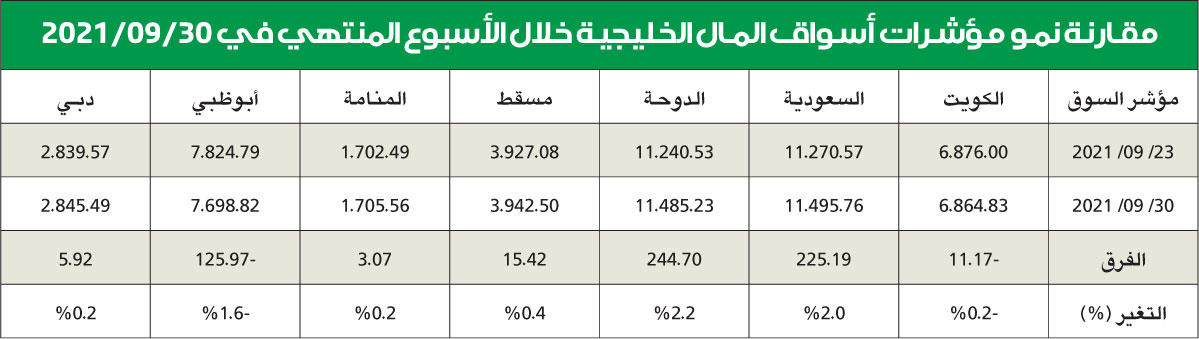 واصل مؤشر «تاسي» الرئيسي في سوق الأسهم السعودي تحقيق اقفالات قياسية، واستطاع أن يصل إلى قمة لم يصل إليها منذ الأزمة المالية العالمية عام 2008، وبعد أن أضاف خلال الأسبوع الماضي نسبة 2 في المئة، أي 225.19 نقطة، ليقفل على مستوى 11495.76 نقطة، وهي أعلى اقفال منذ 13 عاما، مدعوما بنمو قطاع المواد الأساسية والطاقة والبنوك التي استفادت من الارتفاع الكبير والمفاجئ لأسعار النفط التي تجاوزت مستوى 80 دولارا للمرة الأولى منذ 3 سنوات، وتصدر سهما «سبكيم العالمية» و»سابك للمغذيات» قائمة الشركات المرتفعة بنسبة 13 في المئة، وتضمنت القائمة سهم «سابك» المرتفع بنسبة 4 في المئة، وهو ذو الوزن الكبير في مؤشر «تاسي» والمستفيد بشكل مباشر من ارتفاع أسعار الطاقة عالميا.حققت 3 مؤشرات أسواق مالية خليجية مكاسب محدودة، هي عمان والبحرين ودبي، حيث ربح الأول نسبة 0.4 في المئة، أي 15.42 نقطة، ليقفل على مستوى 3942.5 نقطة، ويبقى على مكاسب بنسبة 7.8 في المئة لهذا العام، وبعد تذبذب خلال الأسبوع الأخير من الربع الثالث، بالرغم من مكاسب أسعار النفط القياسية والتي قلصت عجز موازنات دول مجلس التعاون الخليجي جميعها. وتساوى مؤشرا سوقي البحرين ودبي في المكاسب، والتي كانت الأقل وهي عُشري نقطة مئوية، حيث ربح مؤشر سوق البحرين 3.07 نقاط، ليقفل على مستوى 1705.56 نقاط، ويكتفي بمكاسب بنسبة 3.5 في المئة لهذا العام وهي الأقل خليجيا، بينما لم يستفد مؤشر سوق دبي المالي والذي ينتظر بشغف افتتاح «إكسبو 2020»، الذي تم أمس الأول بداية الشهر الجاري من زخم أخبار المعرض وانتهت تعاملاته بنمو متواضع بـ 5.92 نقاط، ليقفل على مستوى 2845.49 نقطة.تراجعات متفاوتة في مؤشري أبوظبي والكويت