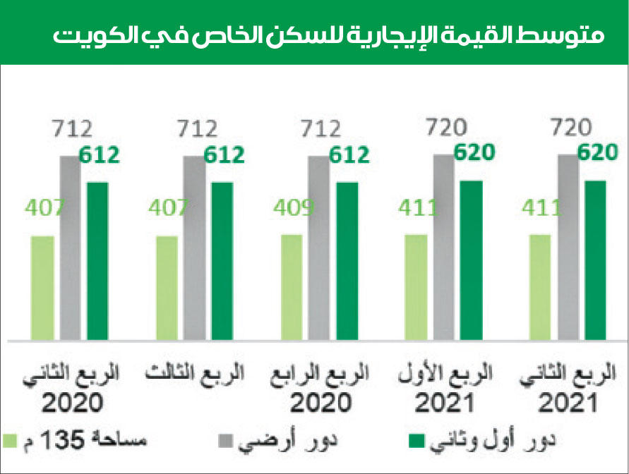 والقيمة الإيجارية للدور الكامل الأرضي من عقار السكن الخاص مساحة 400 متر، يصل متوسط القيمة الإيجارية لهذه الفئة مستوى المحافظات 820 دينارا مرتفعاً 5 في المئة عن الربع الأول، وبزيادة 6 في المئة على أساس سنوي، فيما يصل في محافظة العاصمة إلى 965 دينارا بنهاية الربع الثاني بزيادة 7 في المئة على أساس ربع سنوي وبحدود 8 في المئة على أساس سنوي، في حين تصل في محافظة نحو إلى 913 دينارا بنسبة زيادة 5 في المئة على أساس ربع سنوي وبحدود 6 في المئة على أساس سنوي، وفي محافظة الفروانية تسجل 695 دينارا دون مرتفعاً 3 في المئة عن الربع الأول 2021، وبنسبة مقاربة عن الربع الثاني من 2020.وقد ارتفع متوسط القيمة الإيجارية في محافظة الأحمدي إلى حدود 680 دينارا في الربع الثاني 2021 بنسبة 3 في المئة على أساس ربع سنوي، وبذات النسبة أيضاً على أساس سنوي، بينما زاد في محافظة مبارك الكبير مسجلاً 617 مرتفعاً 2 في المئة عن الربع الأول، وبزيادة تصل إلى 6 في المئة على أساس سنوي، وفي محافظة الجهراء يبلغ متوسط القيمة الإيجارية 640 بزيادة كبيرة قدرها 7 في المئة عن الربع الأول من 2021 والربع الثاني من 2020.ويصل متوسط القيمة الإيجارية للدور الكامل الأول أو الدور الثاني في عقارات السكن الخاص مساحة 400 متر على مستوى المحافظات إلى 720 دينارا، أي بزيادة 5 في المئة عن الربع الأول وتصل إلى 7 في المئة على أساس سنوي. أما في محافظة العاصمة فارتفعت القيمة الإيجارية بنهاية الربع الثاني إلى 865 دينارا بزيادة 8 في المئة عن الربع الأول، وبنفس النسبة على أساس سنوي، وتسجل في أعلى المناطق قيمة كما في مناطق العديلية والفيجاء 1.000 دينار بزيادة سنوية 6 في المئة، وفي الروضة 940 دينارا بزيادة 4 في المئة لنفس الفترة، فيما يصل في أدنى مناطق المحافظة إيجاراً كما في غرناطة إلى 660 دينارا بزيادة 10 في المئة على أساس سنوي، وفي الصليبيخات يصل متوسط القمية الإيجارية إلى 600 دينار بزيادة سنوية 11 في المئة، وفي محافظة حولي يبلغ متوسط القيمة الإيجارية 813 دينارا بزيادة 5 في المئة على أساس ربع سنوي، وبنسبة 7 في المئة عن الربع الثاني 2020، ويصل في أغلب المناطق إلى 400 دينار منها منطقة حطين والشهداء الزهراء، فيما يصل في أدنى المناطق أسعاراً، وهي منطقة سلوى إلى 700 دينار، وارتفع متوسط القيمة الإيجارية لمحافظة الفروانية عند حدود 595 دينارا، ويصل في إشبيلية 660 دينارا كأعلى متوسط إيجار، ويسجل في أغلب مناطق المحافظة 560 دينارا بنهاية الربع الثاني دون تغير ربع سنوي أو عن نفس الفترة من 2020.