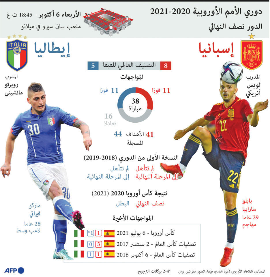 سيكون استاد "سان سيرو" مسرحا لمواجهة من العيار الثقيل بين بطل أوروبا المنتخب الايطالي ونظيره الإسباني، في مباراة نصف نهائي مسابقة دوري الأمم الأوروبية لكرة القدم.وكان المدرب لويس أنريكي واضحاً في مقاربته للمباراة، بالقول "إذا كان علينا اختيار ثلاث كلمات لما نسعى اليه من حيث طريقة اللعب، فستكون الهجوم، الضغط والطموح".ويتجدد الموعد بين الجارين اللدودين على ملعب "سان سيرو" في ميلانو، حيث تسعى إسبانيا الى تحقيق ثأرها من "آزوري" الذي أقصاها من نصف نهائي كأس أوروبا هذا الصيف بركلات الترجيح في طريقه الى الفوز باللقب للمرة الثانية في تاريخه.وتدخل إيطاليا اللقاء بمعنويات مرتفعة، ليس بسبب تتويجها بالكأس القارية فحسب، بل لأنها باتت أيضاً صاحبة الرقم القياسي العالمي من حيث عدد المباريات المتتالية من دون هزيمة بمحافظتها على سجلها الخالي من الخسائر لـ37 مباراة متتالية، وتحديداً منذ 10 أكتوبر 2018، حين سقطت أمام البرتغال في دوري الأمم الأوروبية بالذات.