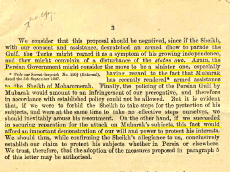 وثيقة لها تاريخ: بريطانيا تكلف «هايفلاير» بالتحرك للبحث والقبض على القراصنة بالتعاون مع الشيخ مبارك والشيخ خزعل