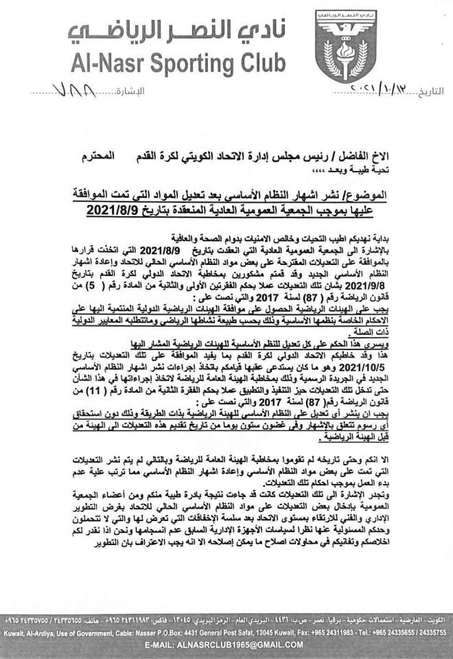 أرسل نادي النصر كتاباً إلى الاتحاد الكويتي لكرة القدم يطلب فيه استعجال إشهار النظام الأساسي بعد تعديل المواد التي تمت الموافقة عليها بموجب الجمعية العمومية المنعقدة في التاسع من أغسطس للماضي.وذكر «النصر» في كتابه أنه عملاً بالفقرة الثانية من المادة (11) من قانون الرياضة رقم 87 لسنة 2017، «يجب نشر أي تعديل على النظام الأساسي للهيئة الرياضية بذات الطريقة وذلك دون استحقاق أي رسوم تتعلق بالإشهار، وفي غضون ستين يوماً من تاريخ تقديم هذه التعديلات إلى الهيئة من قبل الهيئة الرياضية».