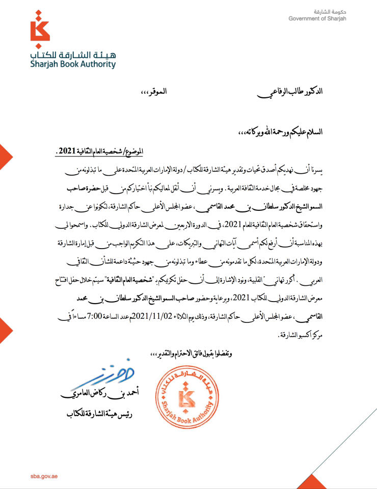 صورة ضوئية من خطاب تسمية الرفاعي شخصية العام الثقافي