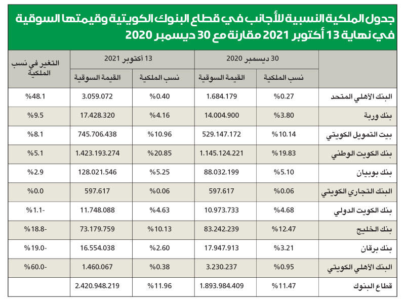ذكر «الشال» أن الملكية النسبية للأجانب في قطاع البنوك، يتصدرها بنك الكويت الوطني، وبنسبة 20.85% من قيمته الرأسمالية.