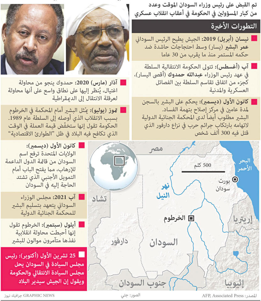 وطالبت القاهرة كل الأطراف السودانية، في إطار المسؤولية وضبط النفس، بـ«تغليب المصلحة العليا للوطن والتوافق الوطني». من جهتها، دعت وزارة الخارجية القطرية جميع الأطراف إلى احتواء الموقف وعدم التصعيد، وعبرت عن تطلّعها لإعادة العملية السياسية إلى المسار الصحيح.كما أعرب الأمين العام لجامعة الدول العربية، أحمد أبوالغيط، عن بالغ القلق إزاء تطورات الأوضاع في الخرطوم، وطالب جميع الأطراف السودانية بالتقيد بالوثيقة الدستورية التي تم توقيعها عام 2019.وشدد الأمين العام لمنظمة التعاون الإسلامي على أن «الحوار هو السبيل لتجاوز الخلافات، تغليبا للمصلحة العليا للشعب السوداني، ولتحقيق تطلعاته في الأمن والاستقرار والتنمية والازدهار».