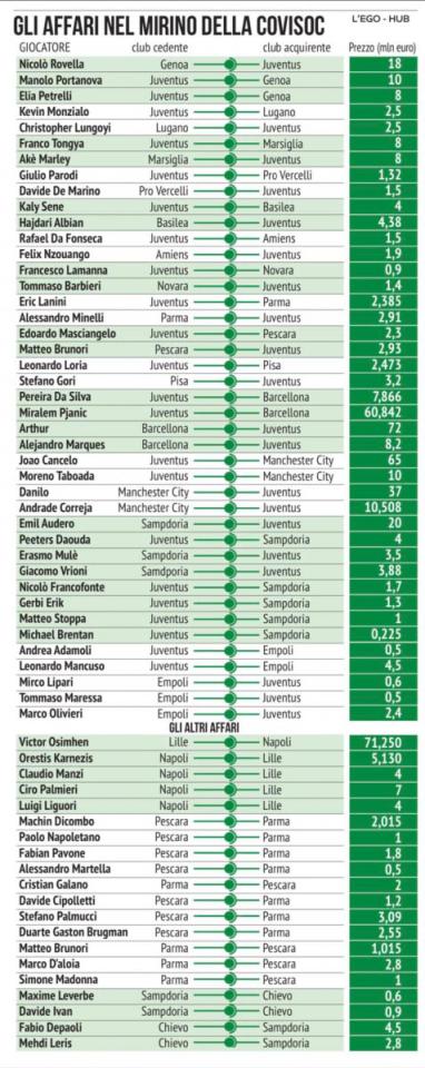 قدمت لجنة الإشراف على أندية كرة القدم في الدوري الإيطالي تقريراً للمدعي العام الفدرالي، بخصوص صفقات انتقال لاعبين بين أندية إيطاليا بمختلف درجاتها تحيط بها شبهات بمكاسب رأسمالية وتضخم في قيم اللاعبين الحقيقة.وأوضحت صحيفتا «لا ريبوبليكا» و«تيمبو» الإيطاليتان أن لجنة الإشراف دققت في عدد من صفقات اللاعبين بين الأندية، وتزعم التقارير أن لجنة الإشراف على الأندية أرسلت تقريراً مفصلاً إلى المدعي العام وإلى رئيس الاتحاد الإيطالي غرافينيا، تطلب منهم التحقيق والنظر في عدد من الصفقات التي بلغت 62 صفقة من بينها 42 كان نادي يوفنتوس طرفاً بها، حيث قام بمبادلة عدد من اللاعبين بقيمة 90 مليون يورو إلا أن جدوى تلك الصفقات لا تتعدى ثلاثة ملايين يورو.