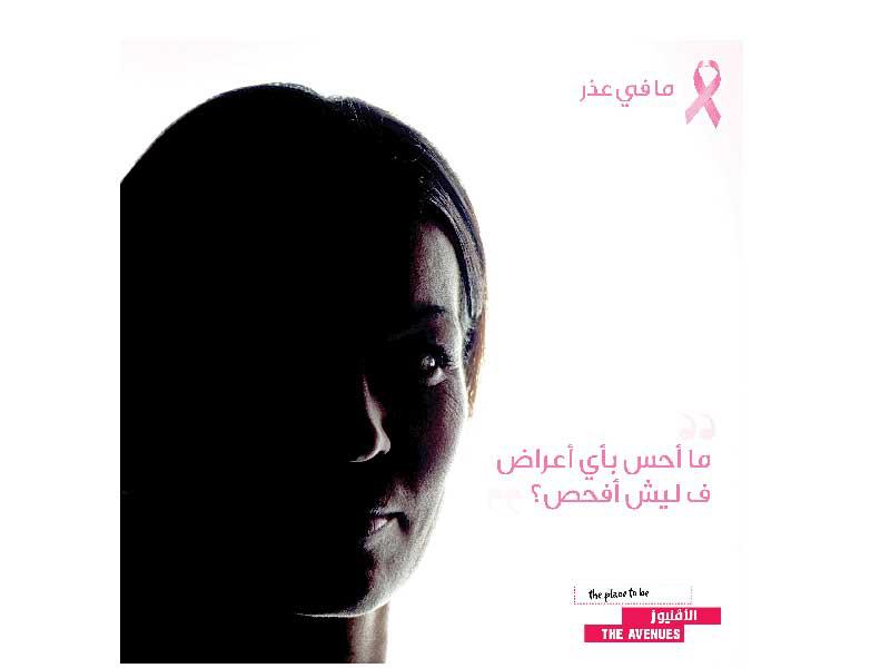 تضامنا مع المبادرة العالمية لرفع وعي المجتمع بمخاطر سرطان الثدي، وأهمية الكشف المبكر لعلاجه؛ أطلق مجمع الأڤنيوز حملة «ما في عذر» لتشجيع السيدات على الفحص من أجل الوقاية من سرطان الثدي والكشف المبكر، بالتعاون مع الحملة الوطنية للتوعية بمرض السرطان (كان).ووجهت حملة «ما في عذر»، التي وجدت في منطقة سكند أڤنيو لمدة 4 أيام، رسالة إلى كل السيدات، مضمونها أنه لا يوجد أي عذر للتأخير في الفحص والاطمئنان على صحتهن للوقاية من سرطان الثدي، كما تضمنت مشاركة متخصصين من حملة كان، الذين وجدوا في الحملة لتقديم المعلومات الطبية والحقائق الصحية حول سرطان الثدي لزوار الأڤنيوز، إضافة إلى توزيع البروشورات والكتيبات الطبية حول أهمية الفحص الذاتي والكشف المبكر لسرطان الثدي، كما شارك في الفعالية عدد من المتعافيات اللاتي حرصن على تقديم النصائح للسيدات من الزوار من خلال تجاربهن.