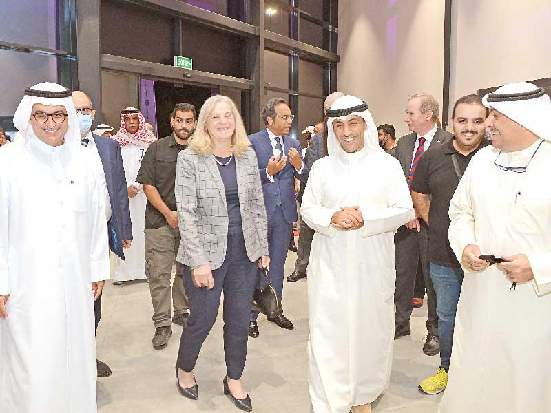 نائب رئيس مجلس إدارة شركة الملا وبهبهاني طلال الملا يرافقه سفيرة الولايات المتحدة لدى دولة الكويت ألينا رومانوسكي ونائب رئيس البعثة في السفارة الأميركية جيمس هولتسنايدر، وعضو مجلس إدارة شركة الملا وبهبهاني طلال بهبهاني يفتتحون صالة العرض الجديدة المستقلة لسيارات جيب في منطقة الري بمناسبة الاحتفالات بالذكرى الـ 15 على تأسيس الشركة