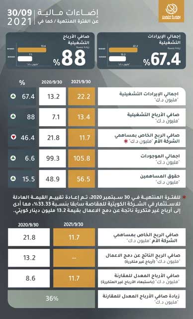 في اجتماع لأعضاء مجلس إدارتها في 1 نوفمبر 2021، أعلنت بورصة الكويت تسجيل إجمالي إيرادات تشغيلية بقيمة 22.2 مليون دينار خلال فترة الأشهر التسعة المنتهية في 30 سبتمبر 2021، أي بزيادة قدرها 67.4 في المئة، مقارنة بنفس الفترة من 2020، حيث بلغ إجمالي الإيرادات التشغيلية نحو 13.2 مليونا، بينما ارتفع صافي الربح التشغيلي ليبلغ 13.4 مليونا، أي بزيادة قدرها 88 في المئة تقريبًا من 7.1 ملايين. وأشارت إلى أنه تم تعزيز الإيرادات من خلال الأداء التشغيلي القوي الذي انعكس في مؤشرات الأداء الرئيسية، بما في ذلك زيادة بنسبة 45.6 في المئة في قيمة التداول، و65.9 في المئة في حجم التداول لفترة الأشهر التسعة المنتهية في 30 سبتمبر.وأعلنت الشركة تحقيق أرباح صافية بقيمة 11.7 مليون دينار لفترة الأشهر التسعة المنتهية في 30 سبتمبر الماضي، والتي جاءت بعد تحول الاستثمار بالشركة الكويتية للمقاصة من شركة زميلة إلى «تابعة» ودمج بياناتها المالية في الربع الثالث من 2020، حيث نتجت إعادة تقييم القيمة العادلة للاستثمار عن أرباح غير متكررة بقيمة نحو 13.2 مليونا، والتي ساهمت في تحقيق صافي ربح قدره 21.8 مليوناً للفترة المقارنة من 2020، لافتة إلى انه باستبعاد الأرباح غير المتكررة، سجل صافي الربح للفترة الحالية زيادة بنسبة 36 في المئة من 8.6 ملايين دينار إلى 11.7 مليونا.