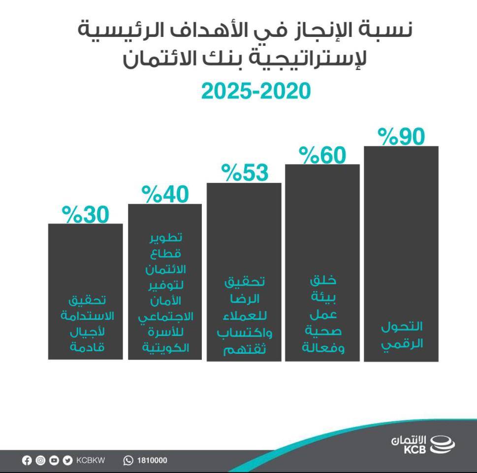 - الهدف الأول: خلق بيئة عمل صحية وفعالة 60%.- الهدف الثاني: تحقيق الرضا للعملاء واكتساب ثقتهم 53%.- الهدف الثالث: التحول الرقمي 90%.- الهدف الرابع: تطوير قطاع الائتمان لتوفير الأمان الاجتماعي للأسرة الكويتية 40%.- الهدف الخامس: تحقيق الاستدامة لأجيال قادمة 30%.