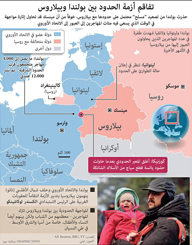 في السياق، احتجزت الشرطة البولندية 50 مهاجرا عبروا الحدود من بيلاروس خلال الساعات الـ24 الماضية، وما زالت تبحث عن آخرين، قرب بيالفييزا. ويأتي ذلك وسط تقارير عن تمكن عشرات الأشخاص من تدمير أسوار قريبة من قريتي كرينكي وبيالويزا وعبور الحدود ليل الثلاثاء - الأربعاء.وقال وزير الدفاع البولندي ماريوس بلاشتشاك لراديو بولندا إن «الوضع ليس هادئا»، مضيفاً أن مجموعات أصغر من المهاجرين تحاول الآن اختراق حدود الدولة العضو في الاتحاد الأوروبي وحلف شمال الأطلسي ناتو، واتهمت وزارة الدفاع البولندية مسؤولين بيلاروسيين باستخدام التخويف لإجبار المهاجرين على اختراق الحدود.إقبال كردي على «مسار مينسك» وميزانية عراقية لاستعادة العالقين
