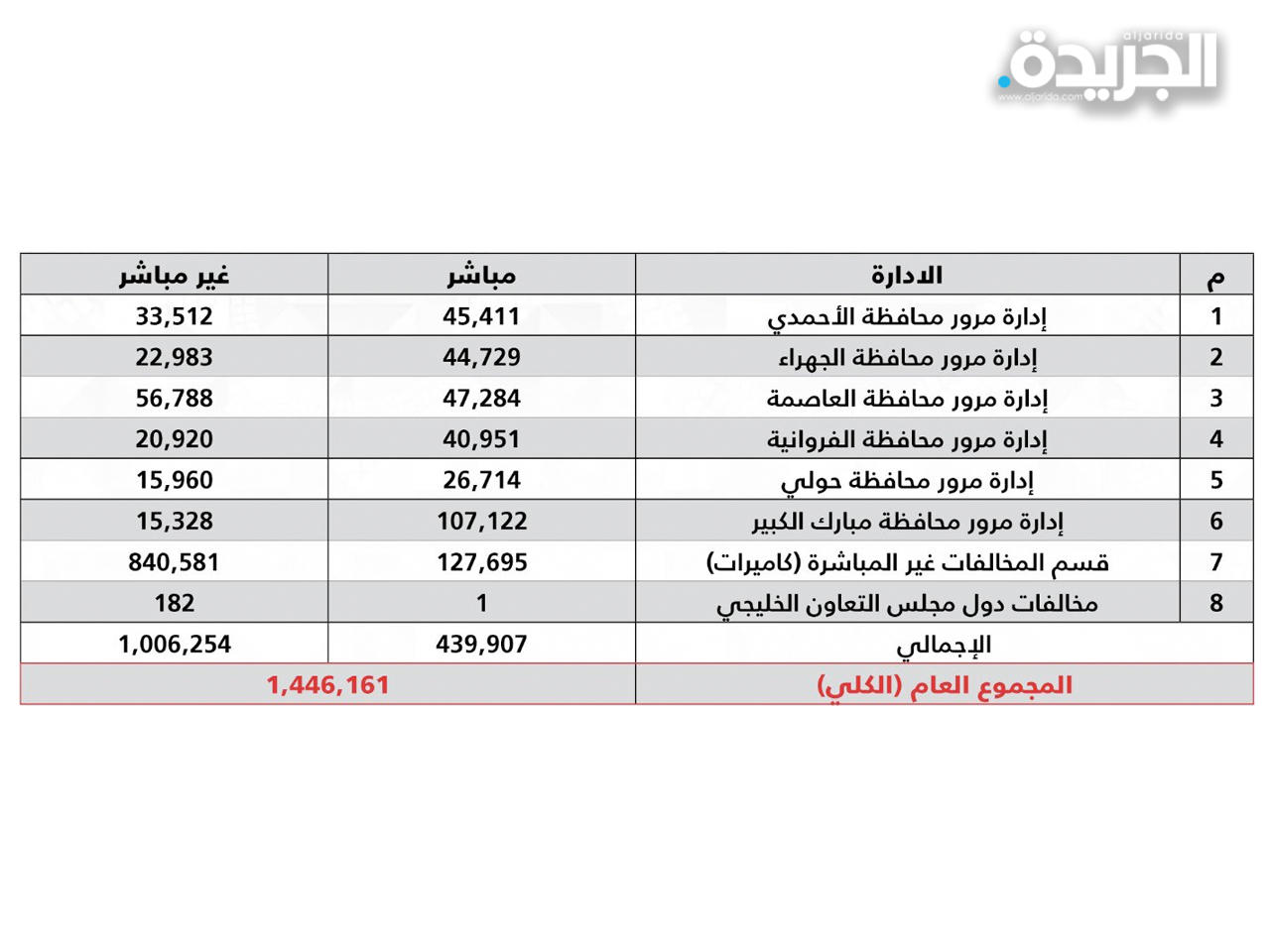 ذكرت الإدارة العامة للعلاقات والإعلام الأمني بوزارة الداخلية، أنه في إطار جهود الإدارة العامة للمرور لفرض هيبة القانون والتصدي للمخالفين والمستهترين وضبط الحركة المرورية وذلك عبر التواجد الميداني على الطرق والمحاور الرئيسية والفرعية وتنفيذ الحملات على مدار الساعة على كافة أنحاء البلاد، وقد أصدر قطاع المرور والعمليات إحصائية تتضمن ما تم تحريره من مخالفات خلال الفترة من 1 يناير 2021 حتى 31 مايو 2021 على مستوى إدارات المرور وقد بلغت 1,446,161 مخالفة وكانت على النحو التالي:إدارة الأحمدي «45411 مباشر - 33512 غير مباشر»، إدارة الجهراء «44729 مباشر - 22983 غير مباشر»، إدارة العاصمة «47284 مباشر - 56788 غير مباشر»، إدارة الفروانية «40951 مباشر - 20920 غير مباشر»، إدارة حولي «26714 مباشر - 15960 غير مباشر»، إدارة مبارك الكبير «107122 مباشر - 15328 غير مباشر»، الكاميرات «127695 مباشر - 840581 غير مباشر»، دول الخليج «1 مباشر - 182 غير مباشر»، الإجمالي «439907 مباشر - 1006254 غير مباشر».