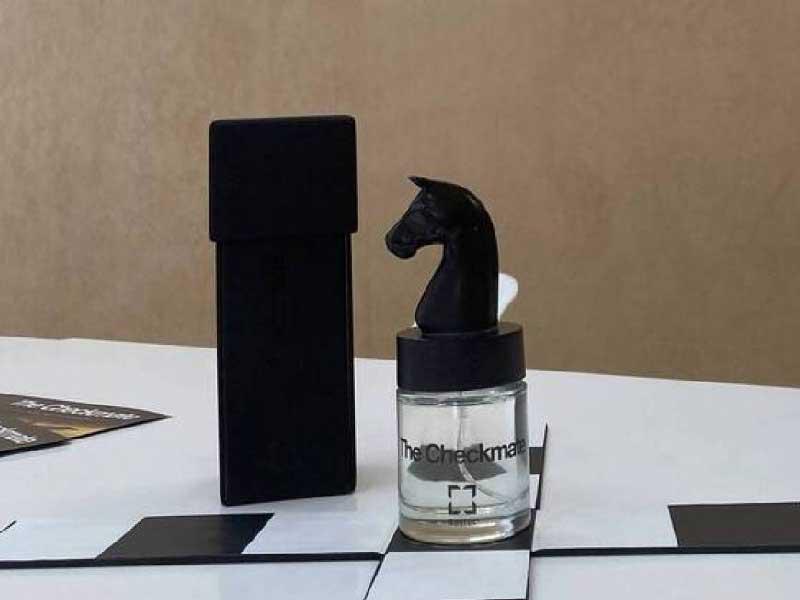 ويزيّن حصان الشطرنج الأسود غطاء زجاجة العطر، ويتفكك صندوق الهدايا عند فتحها إلى رقعتي الشطرنج السوداء والبيضاء.
