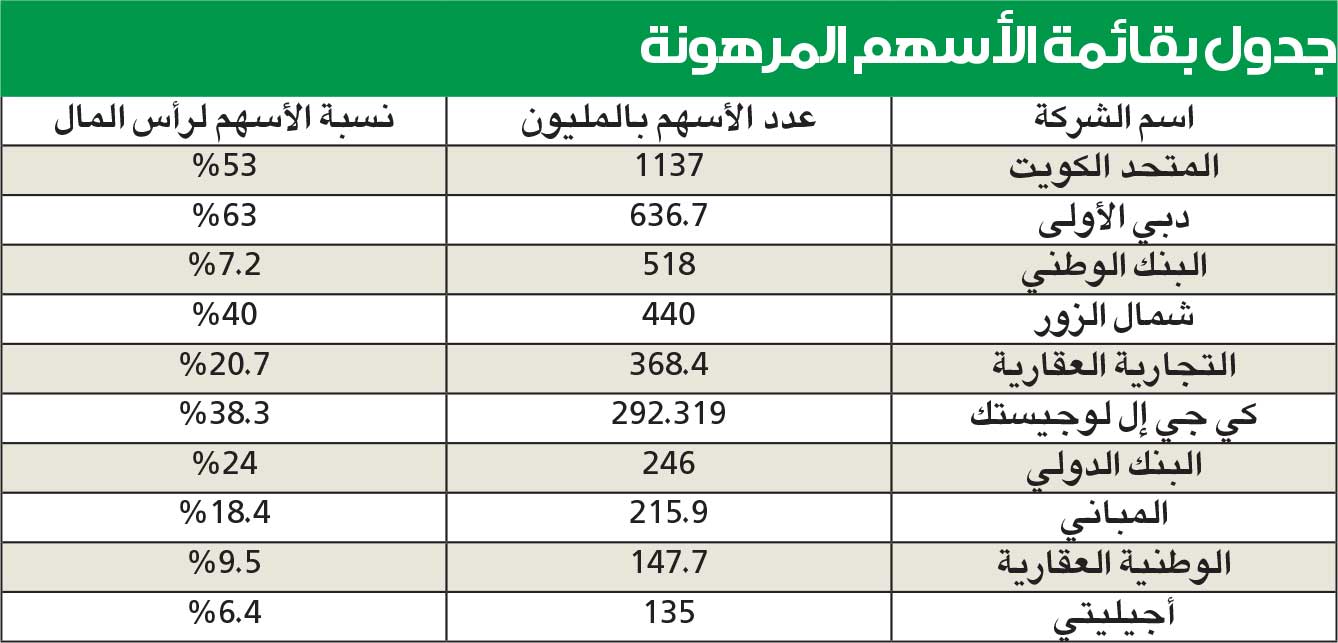 أظهرت قائمة الأسهم المرهونة لأعلى 10 شركات مدرجة في البورصة أن نسبة الرهونات من رأس المال تتراوح بين 53 في المئة من أسهم البنك الأهلي المتحد الكويت و6.4 في المئة من رأسمال شركة أجيليتي.وبحسب مصادر لا تزال الأسهم التشغيلية التي تتميز بنشاط واضح وتحظى بثقة المستثمرين من الرهونات المقبولة لدى البنوك، وخلال العام الحالي مولت المصارف الكثير من العملاء الأفراد والمؤسسات بمئات الملايين مقابل أسهم مدرجة.وعمليا يمكن الإشارة إلى أن ضمانات الأسهم شهدت انتعاشة خلال الأشهر التسعة الأولى من العام الحالي ربما كانت من بين أبرز أسباب تراجع خفض المخصصات نتيجة وجود ضمانات كافية، وتراجع الانكشافات من جهة ثانية والاكتفاء بالقائم من الرهونات.