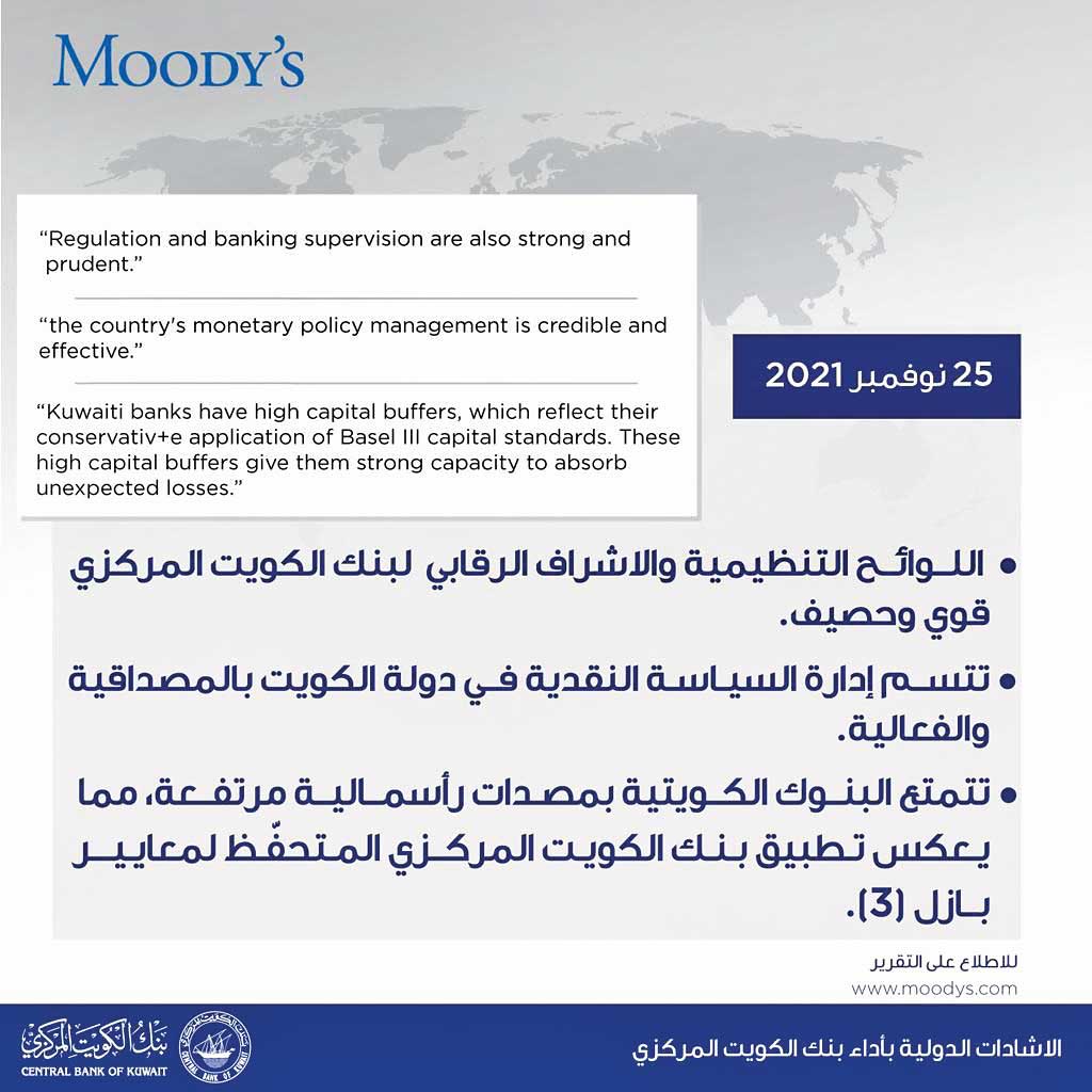 رفعت الوكالة تقييمها للقوة الاقتصادية لدولة الكويت من الدرجة الأولية "baa3" إلى الدرجة النهائية "a2" لتعكس مستويات الثروة العالية بشكل استثنائي، فضلاً عن ثرواتها الهائلة من النفط، حيث تمتلك دولة الكويت إلى حد بعيد أكبر نسبة من احتياطيات النفط المؤكدة إلى الإنتاج بين دول مجلس التعاون، والتي من المقدر استمرارها إلى نحو 100 عام وفقا للمستويات الحالية من الإنتاج. إلى جانب تكاليف الإنتاج المنخفضة نسبيًا، فإن هذا يدعم مستويات مرتفعة من الثروة الوطنية، حيث بلغ نصيب الفرد من الناتج المحلي الإجمالي من حيث القوة الشرائية نحو 43 ألف دولار عام 2020.2) تصنيف القوة المؤسساتية