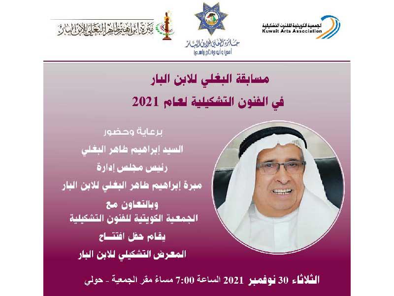 تنطلق اليوم مسابقة البغلي للابن البار في الفنون التشكيلية، برعاية وحضور إبراهيم طاهر البغلي، رئيس مجلس إدارة مبرة إبراهيم طاهر البغلي للابن البار، وبالتعاون مع الجمعية الكويتية للفنون التشكيلية. ويقام حفل افتتاح المعرض بمقر الجمعية الكويتية للفنون التشكيلية في منطقة حولي. وفي تصريح صحافي، قال الفنان عبدالرسول سلمان، رئيس مجلس إدارة الجمعية الكويتية للفنون التشكيلية: "شهدت المسابقة إقبالاً كبيراً للمشاركة في فعالياتها، وجسَّدت حالة متفردة من الوعي والشعور بالانتماء للوطن والأسرة، ورصدت اللوحات ملامح حب الأبناء لآبائهم وأمهاتهم بلغة تشكيلية متفردة ورؤية فنية. تم إعلان مسابقة ابن البار لهذا العام في أغسطس 2021 بجميع مواقع التواصل الاجتماعي".