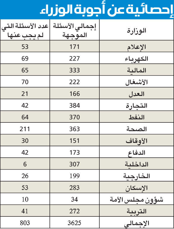 وسط ترقب إعلان التشكيلة الحكومية الجديدة، فإن نحو 803 أسئلة برلمانية تنتظرها بحاجة إلى الرد عنها، حيث لم تقم الحكومة الحالية المكلفة تصريف العاجل من الأمور بالرد عليها، حتى تاريخه، رغم أن بعضها تم توجيهه منذ ديسمبر الماضي.