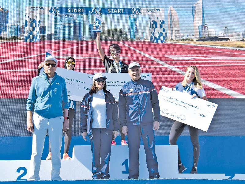 توّج «الوطني» في ختام السباق 12 فائزاً، وهم الأوائل عن الفئات المشاركة من النساء والرجال في سباق الجري، وتكريم الفائزين بالمراكز الثلاثة الأولى عن مسافة 11 كم بجوائز نقدية 1000 و700 و500 دينار. أما الفائزون بالمراكز الأولى عن مسافة 5 كم، فبجوائز نقدية 500، 400 و300 دينار.أصحاب الهمم