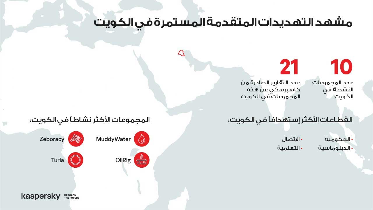 راقب باحثو شركة كاسبرسكي العالمية عن كثب مشهد التهديدات المتقدمة المستمرة (APT) في الكويت، وأعدّوا 21 تقريراً استقصائياً تتعلق بعشر عصابات رقمية تستهدف البلاد بنشاط منذ اندلاع جائحة كورونا عام 2020.واشتملت التقارير على معلومات عن التهديدات والتحقيقات المرتبطة بالعصابات الرقمية التي تستهدف الدولة. ووجدت كاسبرسكي، أن هذه العصابات تستهدف في الأساس المؤسسات الحكومية والهيئات الدبلوماسية فضلاً عن المؤسسات التعليمية وشركات الاتصالات في الكويت.وتشمل الجهات المستهدفة الأخرى المؤسسات المالية وشركات تقنية المعلومات ومؤسسات الرعاية الصحية وشركات المحاماة والجهات العسكرية.
