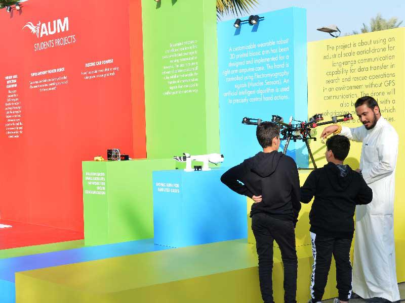 شارك طلبة الهندسة والتكنولوجيا في AUM بالمعرض عبر جناح خاص، حيث قاموا بعرض بعض من مشاريع التخّرج المتعلقة بالكهرباء والطاقة المتجددة والابتكار بشكل عام، منها على سبيل المثال لا الحصر:• طائرة بدون طيار (درون) تعمل بالكهرباء تمّ تطويرها من قبل الطلبة وقاموا بتزويدها بقدرة اتصال طويلة المدى لعمليات البحث والإنقاذ.• شبكة أقمار صناعية صغيرة لنقل معلومات مشفرة.• سيارات صغيرة تعمل على الطاقة الشمسية.• تحدي السومو للروبوتات. • ذراع إلكترونية (Bionic Arm). • تحديد المسار المروري لمركبة كهربائية.وشهد جناح جامعة الشرق الأوسط الأميركية بالمعرض إقبالا كثيفا من الحضور الذين تفاعلوا مع الطلبة في AUM وتعرفوا على مشاريعهم المبتكرة.يذكر أنّ الروبوت Pepper الذي كان موجوداً في المعرض، قام بتقديم شرح عن مشاريع الطلبة ونبذة عن الجامعة. ويعتبر Pepper أحد أبرز الروبوتات الموجودة في قسم بحوث الذكاء الاصطناعي في AUM المجهّز بمجموعة واسعة من وحدات الروبوتات من ضمنها NAO Pepper ،UXA 90 ،Robot Builder، ومختبر برمجة حركة الروبوتات الآلية والجوية الذي يوفّر طائرات Vicon، التي تعد الأحدث في مجال رصد وإرسال بيانات تحركات الروبوت للمبرمج.مركز مرموق لـ AUM في تصنيف Green Metric