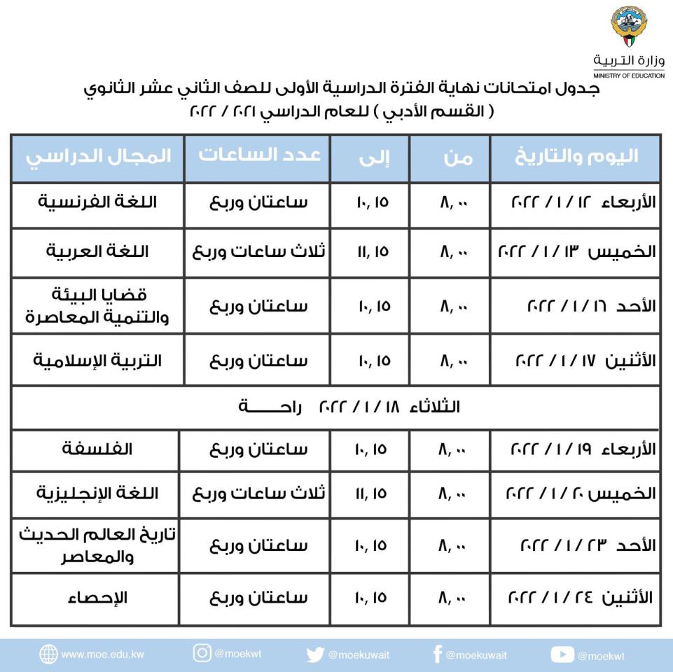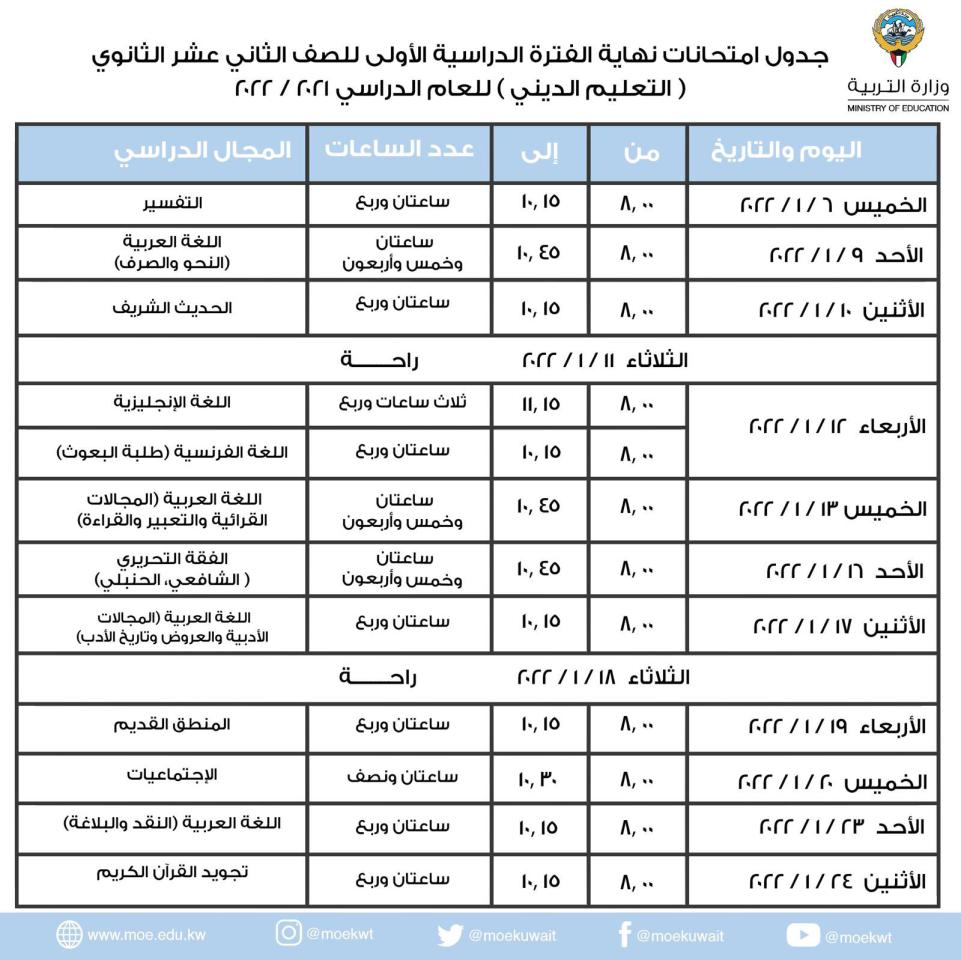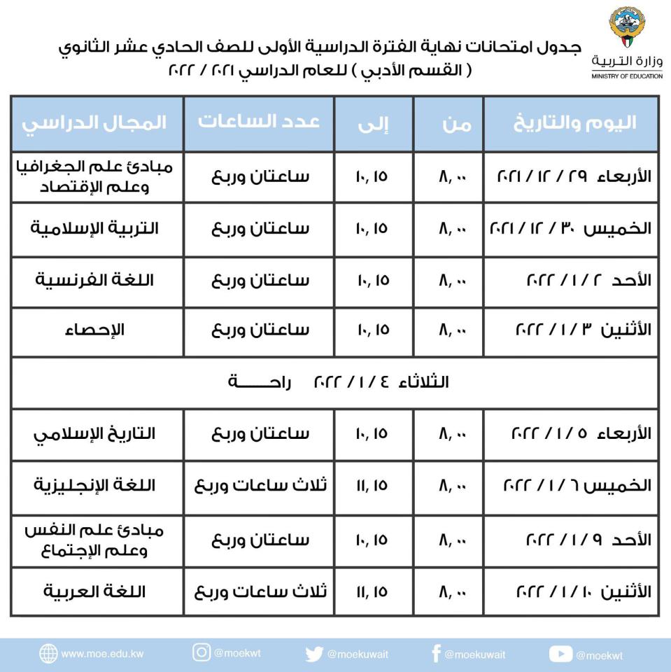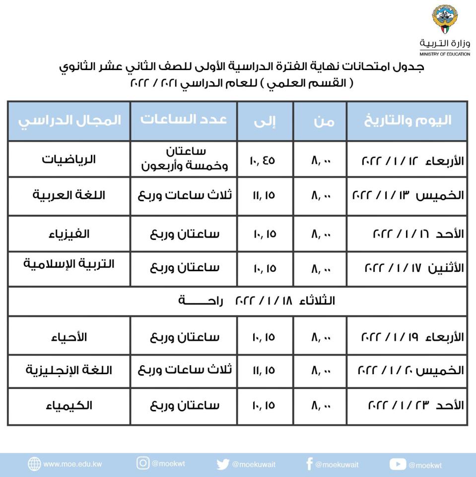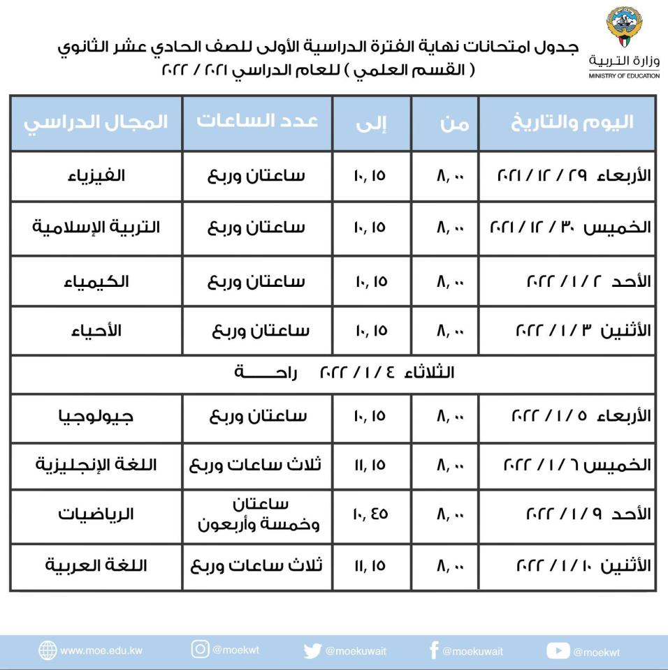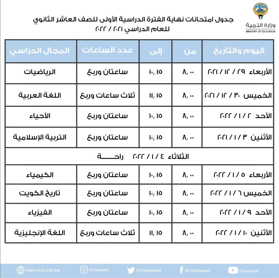اعتمد الوكيل المساعد للتعليم العام أسامة السلطان جداول امتحانات نهاية الفترة الدراسية الأولى للمرحلة الثانوية للأقسام «العلمي والأدبي» والتعليم الديني للعام الدراسي 2021/22.والتي ستنطلق يوم 29 ديسمبر 2021 وتنتهي يوم 24 يناير 2022.
