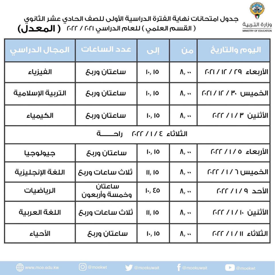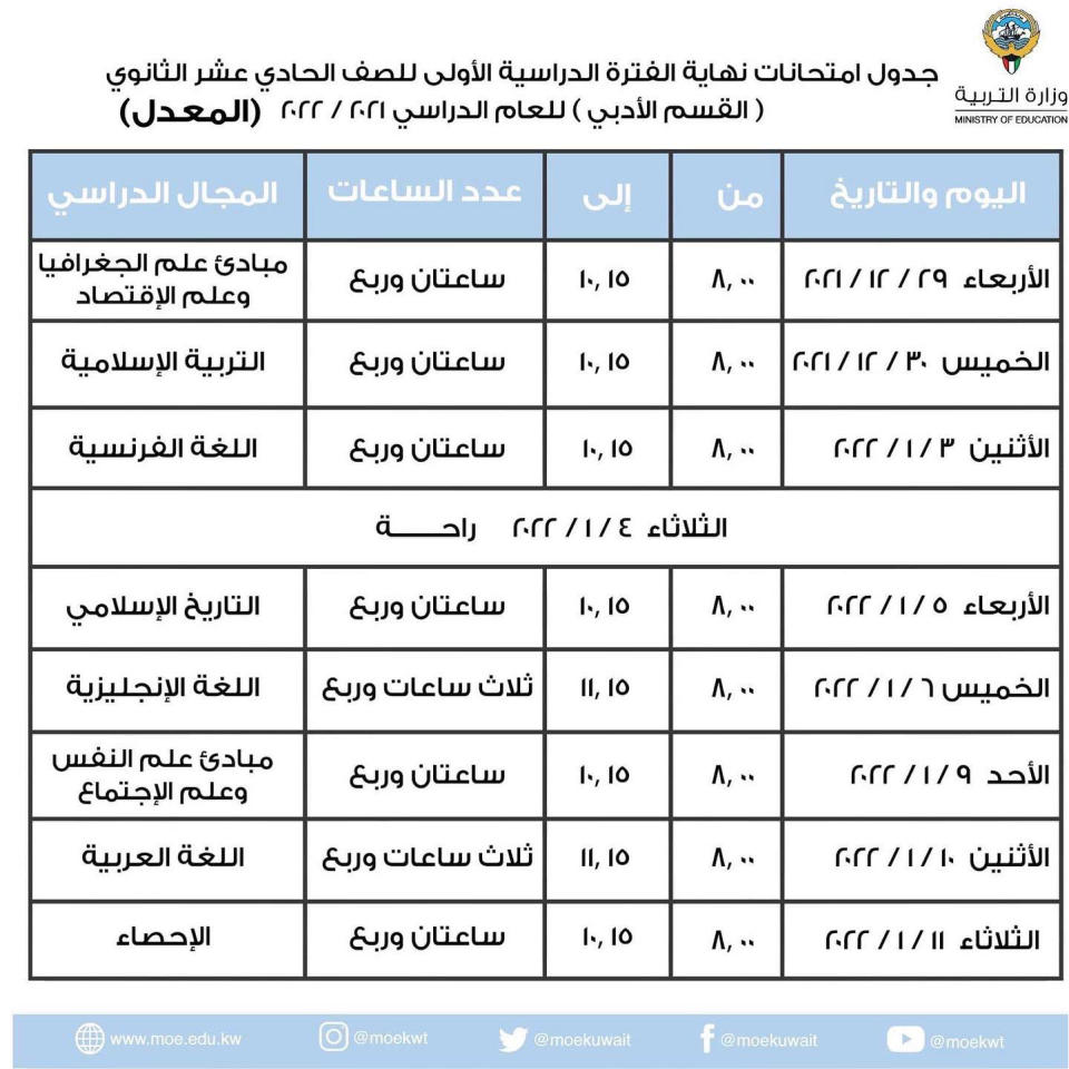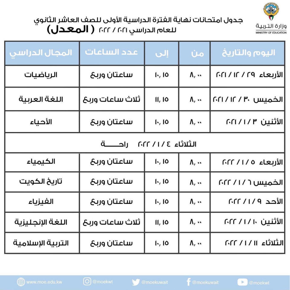 بعد قرار مجلس الوزراء بشأن اعتبار يوم الأحد الموافق 2 يناير 2022 يوم راحة، اعتمد الوكيل المساعد للتعليم العام في وزارة التربية أسامة السلطان الجداول المعدلة لامتحانات نهاية الفترة الدراسية الأولى للعام الدراسي 2022/21 لكل من الصف العاشر والحادي عشر، على أن تبقى جداول الصف الثاني عشر بقسميه العلمي والأدبي وجدول اختبارات المعهد الديني كما هي دون أي تغيير.وتضاف نصف ساعة «لطلبة صعوبات التعلم» لجميع المواد، بناءً على قرار مجلس التوجيهات العامة تم إضافة 15 دقيقة على زمن الامتحانات لكل مجال دراسي لمنح الطلبة وقت لقراءة التعليمات والتأكد من عدد أوراق الأسئلة.