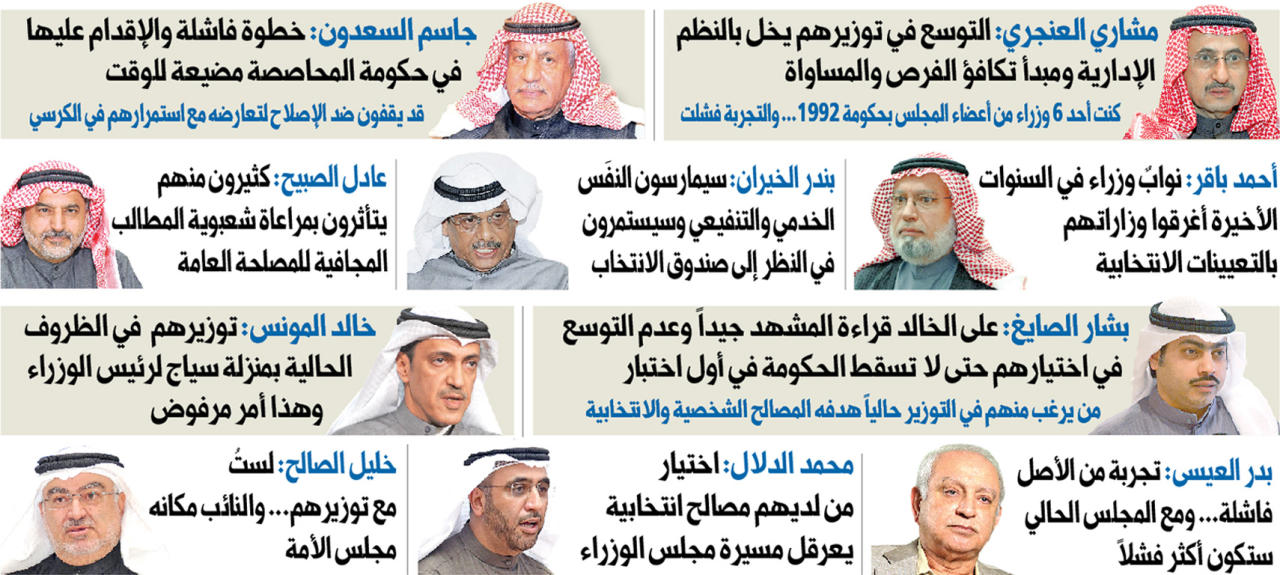 وفي السياق ذاته، حذر النائب والوزير السابق أحمد باقر من مغبة اختيار نواب وزراء جل اهتمامهم تنفيذ أجندتهم الانتخابية واستخدام الواسطات والمحسوبيات وعدم الالتزام بالقانون والأهداف الحقيقية للبلاد في المرحلة الراهنة.ومع تأكيده أن العديد من النواب الموزرين سيمارسون النفس الخدمي والتنفيعي، ما أمكنهم ذلك، وسيستمر بعضهم بالنظر إلى صندوق الانتخاب وإرضاء قاعدته الانتخابية بشكل رئيسي وأولي، قال رئيس اللجنة المركزية في المنبر الديموقراطي بندر الخيران، إن «هذا لن يكون سبباً لتراجعنا عن مطالبنا بإلزامية تطبيق الدستور بفعالية».واتخذ وزير التربية والتعليم السابق د. بدر العيسى نفس الموقف الرافض بقوله «أنا ضد توزير النواب، لأننا مررنا بتجارب عديدة، ولم تنجح، لأن ديموقراطيتنا ليست كاملة، إذ ليس لدينا أحزاب حتى توزر نواباً»، مشدداً على أن تجربة التوسع في توزير النواب من الأصل فاشلة، ومع المجلس الحالي ستكون أكثر فشلاً، في وقت اشترط النائب السابق محمد الدلال أن يتم اختيار من يتمتعون بالخبرة السياسية، وألا يكون لديهم مصالح خاصة أو انتخابية من شأنها أن تعرقل مسيرة مجلس الوزراء أو تخلق مشكلة.نيابياً، أكد النائب خالد المونس أن التوسع في توزير النواب في الظروف الحالية ما هو إلا حماية وصناعة سياج لرئيس الوزراء، كما يحدث حاليا، وهذا أمر مرفوض، وعلى الجميع أن يدرك أن محاولة الإنعاش لن تجدي نفعا. أعرب نائب رئيس مجلس الأمة الأسبق مشاري العنجري عن رفضه العودة إلى تجربة الإكثار من توزير النواب، مؤكدا ضرورة تقليلهم الى أدنى حد، لعدة اعتبارات، أهمها قلة عدد أعضاء المجلس، وإفراغه من بعض الكفاءات اللازمة للمساهمة في حمل أعباء السلطة التشريعية وأداء رسالة المجلس ولجانه المختلفة بشكل أفضل، في الوقت الذي تزخر البلاد بالكفاءات الكثيرة المتميزة خارج المجلس.وأشار العنجري إلى أن اختيار عدد كبير من الوزراء من أعضاء المجلس يؤدي الى أن يصبح بعضهم مدينا في هذا الموقع التنفيذي لناخبيه، فيؤثرهم بكثير من الامتيازات في وزارته أو في جهات حكومية أخرى، بما يخل بالنظم الإدارية وبمبدأ تكافؤ الفرص والمساواة أمام القانون.