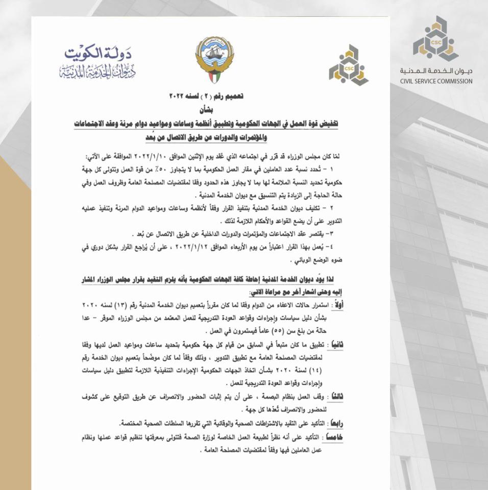 أعلن ديوان الخدمة المدنية تخفيض قوة العمل في الجهات الحكومية، وتطبيق أنظمة وساعات ومواعيد دوام مرنة، فضلاً عن عقد الاجتماعات والمؤتمرات والدورات عبر الاتصال عن بُعد. وأكد الديوان، في تعميم أصدره أمس، ضرورة تقيد الجهات الحكومية بقرار مجلس الوزراء بهذا الشأن مع مراعاة الآتي:• استمرار حالات الإعفاء من الدوام وفقاً لما كان مقرراً بتعميم «الخدمة المدنية» رقم 13 لسنة 2020 بشأن دليل سياسات وإجراءات وقواعد العودة التدريجية للعمل، والمعتمد من مجلس الوزراء، عدا حالة من بلغ سن 55 عاماً فيستمرون في العمل.• تطبيق ما كان متبعاً سابقاً من قيام كل جهة حكومية بتحديد ساعات ومواعيد العمل لديها وفقاً لمقتضيات المصلحة العامة مع تطبيق التدوير، وذلك وفقاً لما كان موضحاً بتعميم الديوان رقم 14 لسنة 2020 بشأن اتخاذ الجهات الحكومية الإجراءات التنفيذية اللازمة لتطبيق دليل سياسات وإجراءات وقواعد العودة التدريجية للعمل.