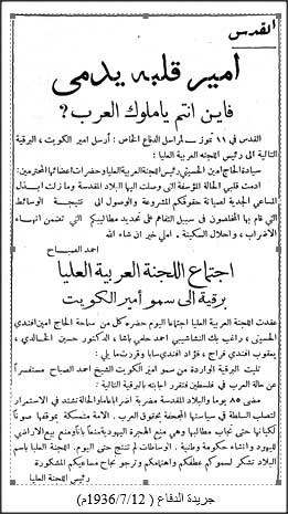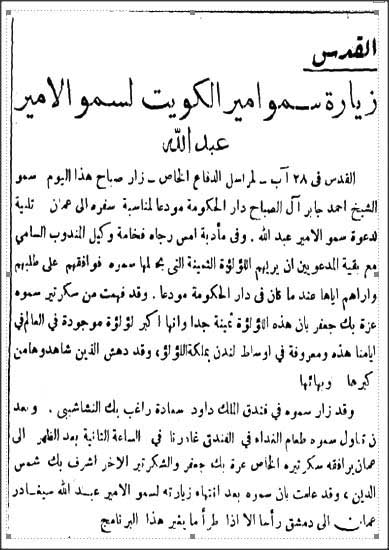 لم يسبق أن سلطت الأضواء بشكل كامل على زيارة الأمير الراحل الشيخ أحمد الجابر إلى فلسطين عام 1935، لكن الكتاب الصادر عن مركز البحوث والدراسات الكويتية وأعده د. حسام السيد ذكي شلبي، فيه إضافة جديدة برصده للصحافة الفلسطينية وما ورد فيها عن زيارته إلى حيفا والقدس والخليل والشخصيات التي التقاها، كما يشرح د. عبدالله الغنيم من "تصديره" للكتاب الذي يفتح المجال لعدد من القضايا وهي: أولها - صلة الكويت قديمة بالأراضي الفلسطينية وبرجالاتها، فالقوافل التي تخرج من الكويت منذ نشأتها المبكرة كانت تمر بفلسطين، وتنقل المتاجر منها وإليها.كما أن زيارة المسجد الأقصى من الأمور التي كان يحرص عليها أهل الكويت، ويبدو ذلك واضحاً في الفترات التاريخية المتأخرة حينما تيسر أمر السفر إلى القدس. ويؤكد اهتمام أبناء الكويت بما يحدث في فلسطين، وعلى وجه التحديد القدس، ففي رسالة مؤرخة بتاريخ (26 من يونيو 1911م) موجهة إلى المرحوم فرحان فهد الخالد، يقول فيها مرسلها: "ولابد بلَغكُم عن سرقة الأجانب من الحرم القدسي، قيل عصا موسى وقيل غيره، وهذا تفصيله في جريدة اللاذقية والرياض فيها مقالات زينة تطلعون على الجميع...".