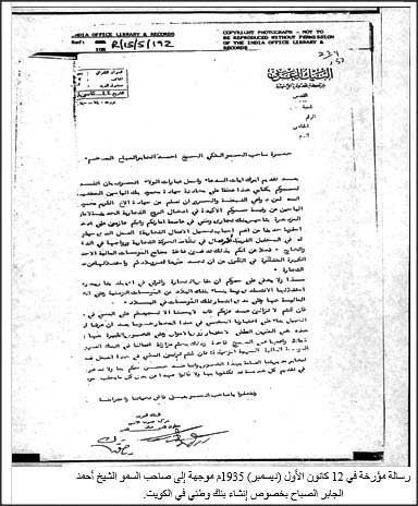 ثالثها- التوقف من خلال اللقاءات عند شخص لازَمَ الشيخ أحمد الجابر في معظم لقاءاته هو السيد رشيد أفندي الحاج إبراهيم، وهو مدير البنك الأهلي بالقدس، الذي ذكرت صحيفة "الدفاع" أنه قد زار الكويت عام 1923م، وأصبحت له علاقة بصاحب السمو منذ ذلك الوقت. وقد ذكرت الصحيفة أن الأمير مكث في زيارته للبنك الأهلي نحو ساعة، ثم طلب أن يجتمع بمديره السيد رشيد الحاج إبراهيم بعد ظهر ذلك اليوم. ويبدو أنهما قد ناقشا معاً مسألة تأسيس بنك في الكويت التي كانت تخلو في ذلك الوقت من مثل هذه المؤسسات. وقد تأكد لنا ذلك من وثيقة محفوظة ضمن الوثائق البريطانية، تتمثل في رسالة مرسلة من السيد رشيد الحاج إبراهيم مدير البنك الأهلي إلى الشيخ أحمد الجابر الصباح، مؤرخة في 12 من ديسمبر 1938م حول إنشاء البنك.ولعل هذه هي المرة الثالثة التي يثار فيها موضوع إنشاء بنك في الكويت، فقد كانت الأولى في عام 1917م حينما بعث المعتمد السياسي البريطاني في الكويت (هملتن) رسائل إلى بعض التجار، منهم صقر العبدالله الصقر وأحمد محمد صالح الحميضي، يطلب فيها إبداء الرأي في الوسائل الكفيلة بتفعيل التجارة مع بريطانيا، وبيان المعوقات التي تواجه العمل التجاري، مع استفسارات أخرى، يهمنا منها السؤال الذي أورده في هذا الصدد وهو "هل الكويت في حاجة إلى فرع من البنك؟". وكان الجواب من الاثنين المذكورين "إننا لا نرى أن البلد في هذا الوقت بحاجة إلى شعبة البنك، ثم جرت في الفترة من عام 1935م إلى عام 1937م مراسلات مع الشيخ أحمد الجابر من البنك العثماني لفتح شعبة له في الكويت، لكن تلك المراسلات لم تصل إلى نتيجة. ولم يتم إنشاء بنك في الكويت إلا في عام 1942م عندما افتتح فرع من البنك الشاهي البريطاني، الذي تغير اسمه إلى البنك الإمبراطوري ثم أصبح "البنك البريطاني للشرق الأوسط". أما أول بنك وطني فهو "بنك الكويت الوطني" الذي تأسس عام 1952م.