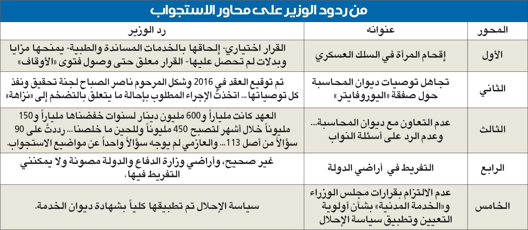رغم تفنيد نائب رئيس مجلس الوزراء وزير الدفاع الشيخ حمد الجابر المحاور الخمسة لاستجوابه الذي سماه «استجواب الساعتين»، على اعتبار أنه قُدم في الثانية عشرة ظهر 4 يناير الجاري بعدما أدى القسم في العاشرة من صباح ذلك اليوم أمام مجلس الأمة، ووسط تأكيده عدم دستورية ذلك الاستجواب، أعلن رئيس المجلس مرزوق الغانم قبيل انتهاء الجلسة العادية أمس، تقدم 10 نواب بطلب طرح الثقة بالوزير، محدداً على أثر ذلك جلسة خاصة تعقد 26 الجاري للتصويت عليه.وبينما قال الجابر إن الاستجواب خالف المادتين 100 و101 من الدستور فيما يتعلق بتحقيق الأمن السياسي للوزير، وهو ما أكدته العديد من التفسيرات الدستورية المعتبرة، أبدى تحفظه عن الاستجواب، مؤكداً أن صعوده المنصة ليس إقراراً بدستوريته، بل فرصة لوضع الأمور في نصابها الصحيح، وأنه مستمر على الطريق القويم وعلى قدر ثقة القيادة السياسية وتطلعات الشعب الوفي.وطغى المحور الأول من الاستجواب، الخاص بـ «التحاق المرأة بالجيش»، على حديث النائب المستجوب حمدان العازمي وكان المحرك الأكبر لتقديم طلب طرح الثقة بالجابر وإعلان غير نائب تأييدهم لذلك، رغم تجديد الوزير تأكيده أن القرار اختياري ويفتح الباب أمام إلحاق المرأة بالوظائف التمريضية والمساندة لا حمل السلاح، فضلاً عن تعليقه انتظاراً لفتوى «الأوقاف» التي ستكون صاحبة الكلمة الفصل بالموضوع.