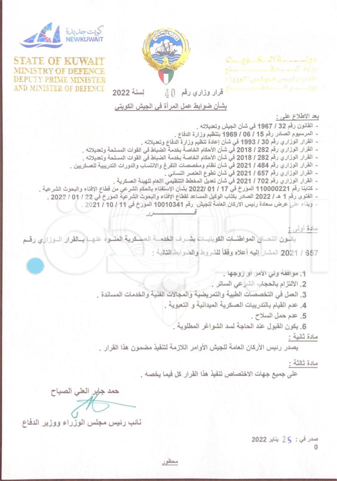 اعتمد نائب رئيس مجلس الوزراء ووزير الدفاع الشيخ حمد جابر العلي الصباح اليوم الثلاثاء قراراً وزارياً يتماشى مع ضوابط فتوى هيئة الإفتاء في وزارة الأوقاف والشؤون الإسلامية الخاصة بانضمام المرأة إلى السلك العسكري.وبحسب القرار الذي حصلت «الجريدة» على نسخة منه، أن الموافقة على التعيين لم تتم إلا بموافقة ولي الأمر أو زوجها، فضلاً عن الالتزام بالحجاب الشرعي الساتر والعمل في التخصصات الطبية والتمريضية والمجالات الفنية والخدمات المساندة وعدم القيام بالتدريبات العسكرية والميدانية والتعبوية وعدم حمل المرأة السلاح وأن قبولها يكون عند الحاجة لسد الشواغر المطلوبة.